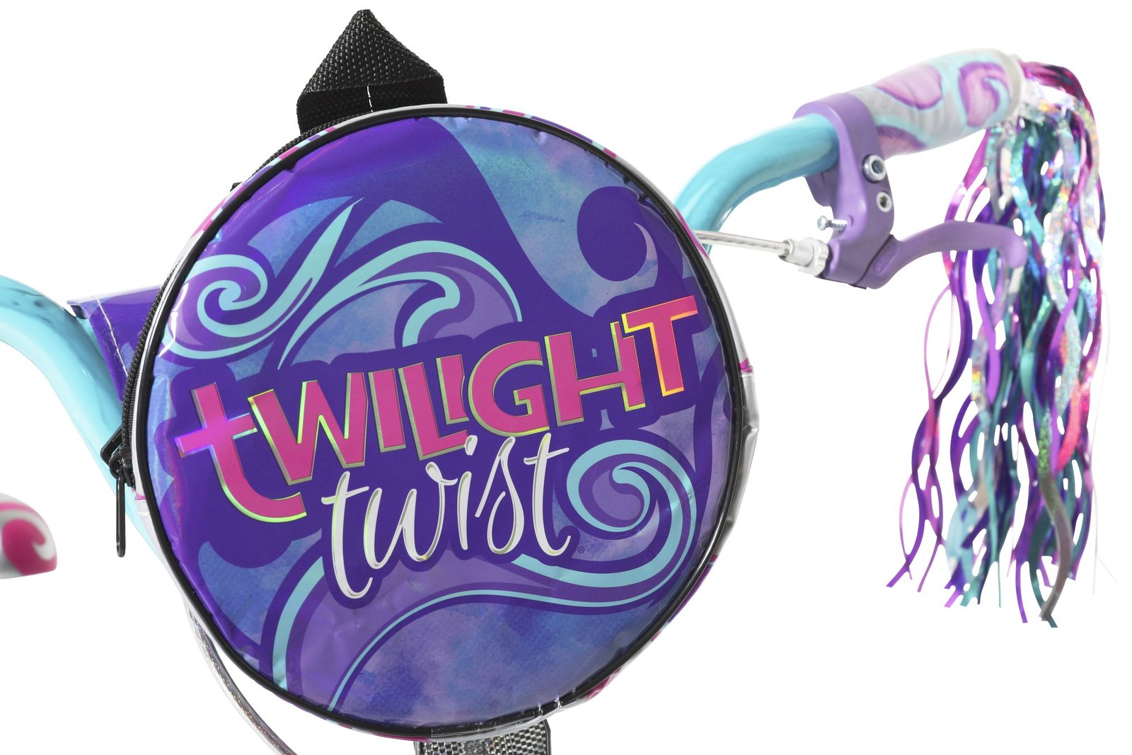 Your little girl will twist and shout when she sees the gorgeous 16” Dynacraft Twilight Twist bike! This charming bike features a bright blue steel frame with custom pink, purple and silver graphics. The 16” Dynacraft Twilight Twist bike features a beautiful handlebar bag, colorful streamers, and a comfort saddle that matches the handlebar grips. The rear coaster brakes help ensure safety and give her the confidence to ride fearlessly. She is set to have an endless amount of fun on the 16” Dynacraft Twilight Twist bike!