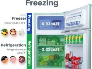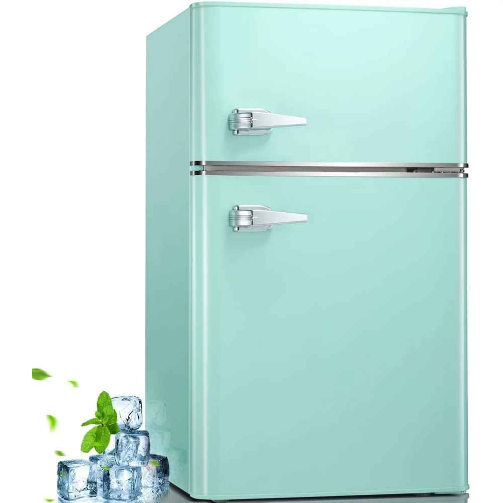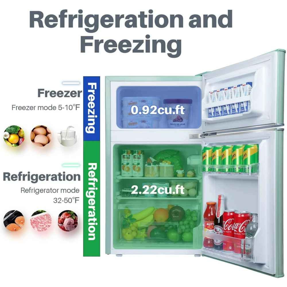 - 【Large Capacity】3.1 Cu. Ft. capacity, divided into two layers, expanding the storage space. The upper layer is a freezer, you can freeze some food, ice bags, ice cubes, ice cream, etc. The lower layer can put some fresh food, such as vegetables and fruits. The refrigerator is equipped with door bin design, whether it is a tall drink bottle or a shorter canned drink, you can place them on it, safe and solid.