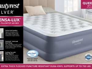 The Beautyrest Silver’s 18 inch Sensa-Lux Dual Coil Pillow Top Air mattress takes quality and comfort with support of a traditional every-night mattress and pairs it with the convenience and portability of an express air bed mattress. The Coil-in-Coil structure offers superior support and pressure relief where your body needs it the most while remaining stronger and more resilient with less motion transfer than a traditional coil bed. The Beautyrest Silver Sensalux has a convenient inset pump that is designed to both inflate and deflate the mattress in just minutes and achieves overall higher firmness levels for all night comfort and support. The top of the mattress uses an extra thick, puncture resistant fabric that also promotes air flow to keep you cool while you sleep all night long. The sides and base are crafted from a high-performance Dura-Vinyl fabric that supports up to 750 pounds. Rest easy with the Beautyrest Silver Sensalux superior contouring comfort and pressure relief.