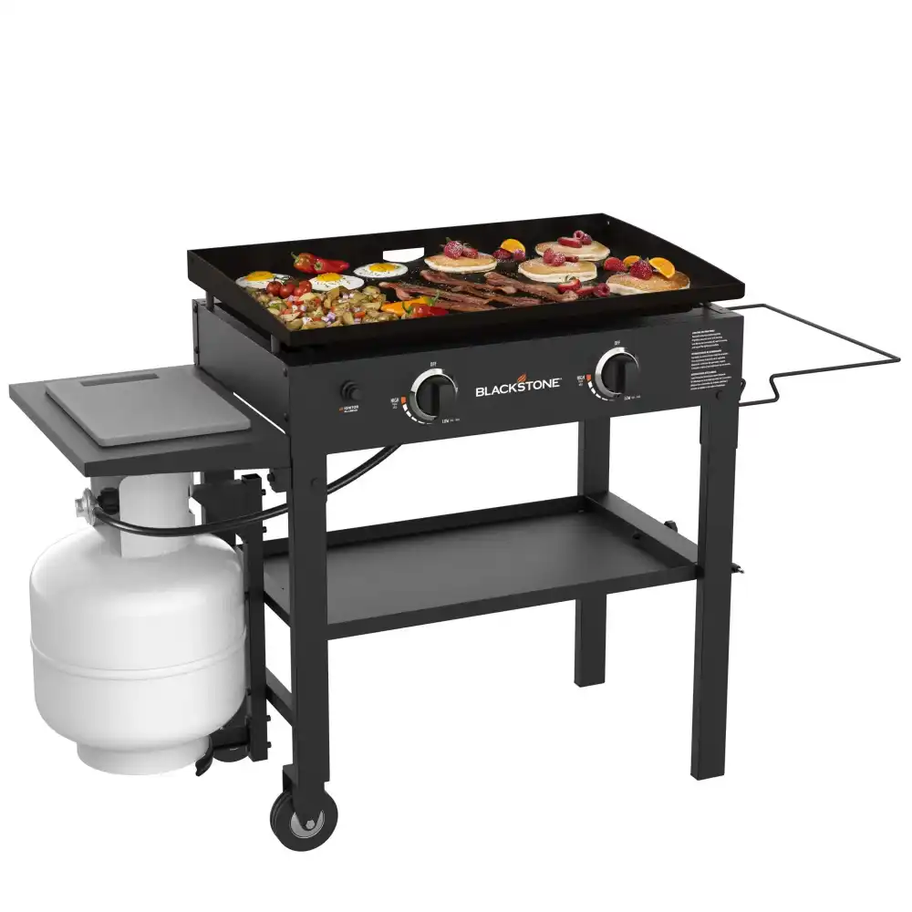 The Blackstone 2 Burner 28” Gas Griddle in Classic Black is perfect for crowds big and small. With a surface big enough to fit 44 hot dogs, you’ll be amazed by this 34, 000 BTU powerhouse! Built with industrial materials for durability and optimal heat distribution. Now with the rear grease management system for no-mess cooking and easy cleanup. Also Comes with a Cutting board and plastic bag holder for greater ease and convenience. Cook anything, anytime, anywhere! This Blackstone Grill is built to last with a powder coated black steel frame, stainless steel burners and thick cold rolled steel cooktop. Patented rear grease technology which is super simple to clean, making post-meal clean-up a breeze