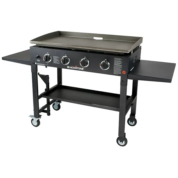 As the cornerstone of Blackstone Products, our 36 Inch Griddle Cooking Station offers an expansive 36 in. x 21 in., 756 sq. in. cooking surface; easy assembly with a quick and easy ignition button; two cantilevered work surfaces and a bottom shelf to make food preparation convenient; easy to remove griddle top, held stable by a stout steel frame and four industrial strength caster wheels, 2 of which lock; thick cold rolled steel griddle cooking surface; steel frame powder coated in protective black; and four independently controlled 15,000 BTU stainless-steel burners, for a total of 60,000 BTUs controlled low-to-high for versatile cooking options. We know you will love using our Blackstone 36 Inch Griddle Cooking Station this summer as much as we will!