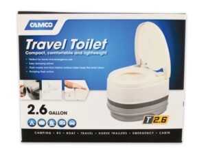 Camco’s 2.6 gallon portable toilet is designed for camping, RVing, boating, or any other recreational activity. It is also great as an emergency option on long car rides. Its sturdy ABS resin construction is compact, lightweight and supports up to 330 lbs.