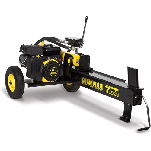 The Champion Power Equipment 90720 7 ton horizontal gas log splitter is small on size but big on power. If you are looking for a quick, dependable and portable solution for log splitting, this is the unit for you. Depend on the reliable recoil start to start up the powerful Champion Power Equipment 80cc single cylinder OHV engine, which features a cast iron sleeve, a 0.4 gallon fuel tank, 0.4 quart oil capacity (recommended 10W-30) and a low oil shutoff for safety. Never struggle to lift a large, heavy log onto your log splitter again. The low profile design makes it much easier to load a large log onto the splitting beam, and the integrated log cradle keeps the log safely in position. This small but mighty machine handles logs up to 19 inches long, weighing up to 50 pounds. Seven tons of splitting capacity deliver the power you need for the job at hand. The hydraulic oil system has a 1.3 gallon oil capacity and operates at 3 gpm to power through tough logs. Champion Power Equipment designed this log splitter with a skewed wedge to increase splitting efficiency, plus it has a 20 second cycle time and dependable auto return valve, which is capable of 180 cycles per hour. The 2 stage gear pump reliably adjusts flow and pressure by delivering high flow/low pressure when there is no resistance and low flow/high pressure when cutting through a log to increase productivity. Assembly and setup are hassle free with Champion Power Equipment clear directions and thoughtful packaging. This log splitter is EPA certified and CARB compliant.