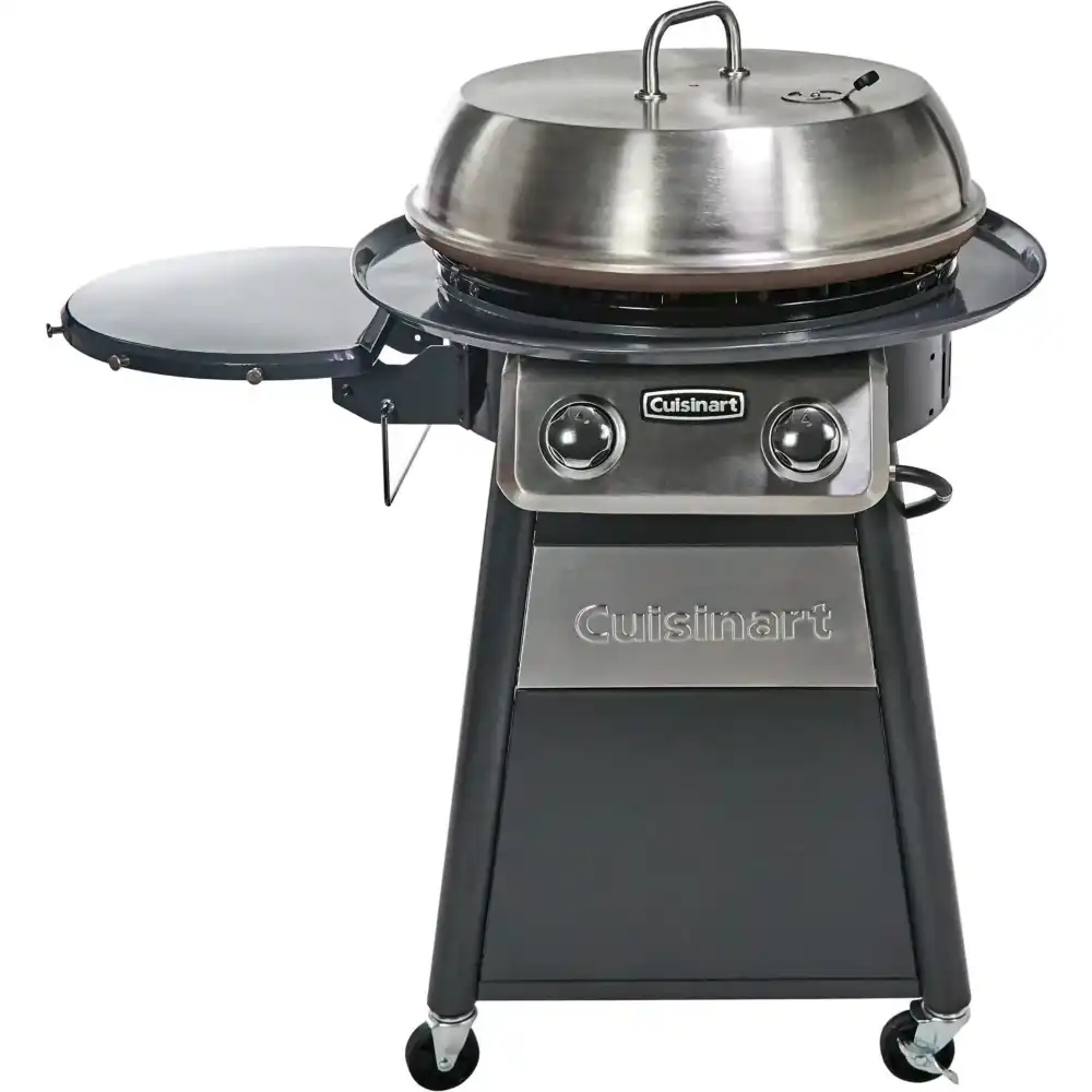Experience 360 degrees of griddle cooking versatility with Cuisinart! Whether you are cooking for a small crowd or a large party, the Cuisinart griddle cooking center will amaze any audience. Breakfast, lunch, and dinner, this 22-inch diameter cooking center with 30,000 BTUs of cooking power can handle it all. It features a 360-degree grease pan and rear grease cup, providing easy access and clean-up. The folding prep table comes equipped with a paper towel holder underneath. This amazing griddle also includes a stainless steel lid with an integrated vent, exceeding the features of an ordinary griddle. This lid creates the versatility to steam, roast, smoke, or warm! From eggs and pancakes to burgers and stir-fry, the Cuisinart griddle cooking center gives you the ability to explore your outdoor culinary creativity.
