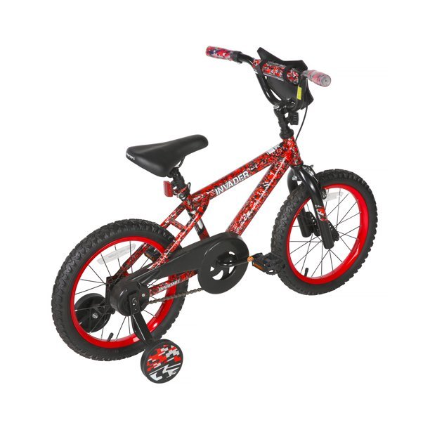Take over the sidewalks on the Dynacraft Invader 16” Bike. This bike comes with an eye-catching, red-and-blue dipped paint finish and Invader branded handlebar shield to offer maximum cool for your little one. The quick release seat post and adjustable/removable training wheels helps the Invader grow with your little one. Command attention with the totally radical Dynacraft Invader 16” Bike.