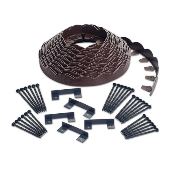 EasyFlex Scalloped No-Dig Landscape Edging gives your landscaping a charming, decorative look with the scalloped edge and mulch brown wood grain texture. It is flexible enough to create tight circles around trees, and the patented No-Dig L-shaped design eliminates damage from digging into tree and plant roots. Use No-Dig Edging with weed fabric for an extra layer of weed protection. The spiral spikes easily pierce through weed fabric and help secure the barrier. The 2.5 inch high edging is strong enough to retain bedding materials including pine needles, lava stone, river rock, cedar, plastic, wood mulch, and more. The scalloped decorative edge provides a lovely finish to any gardening or landscaping project. Designed for quick and easy installation, no digging is required. Simply clear the area of debris and align the edging to the shape of the bed. Use a mallet to pound the anchoring spikes (included) into the ground. Not every project is the same, so No-Dig Edging is easy to cut to the length you need. We recommend cutting between scallops, if possible. Kit includes (1) 100-foot coil of landscape edging, (30) 8 in. spiral spikes, and (5) connectors to accommodate a 100 linear foot installation.