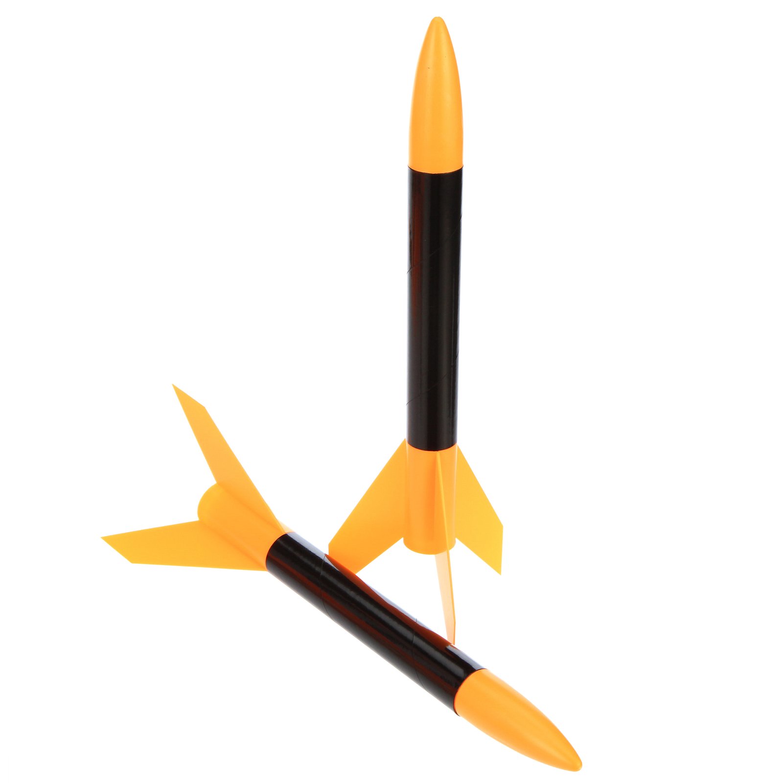 - This jet black rocket has a bright orange plastic nose cone and a one piece plastic fin unit that makes building it almost foolproof