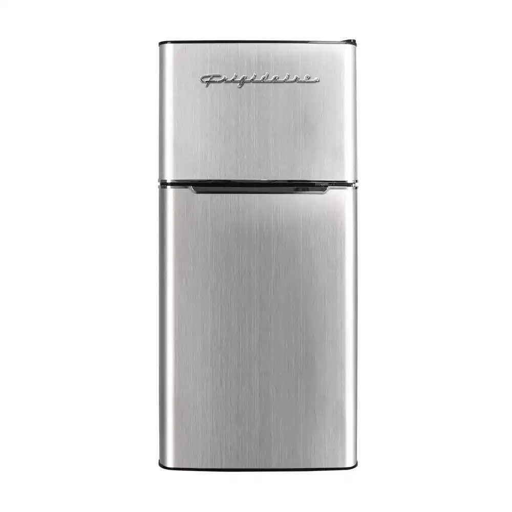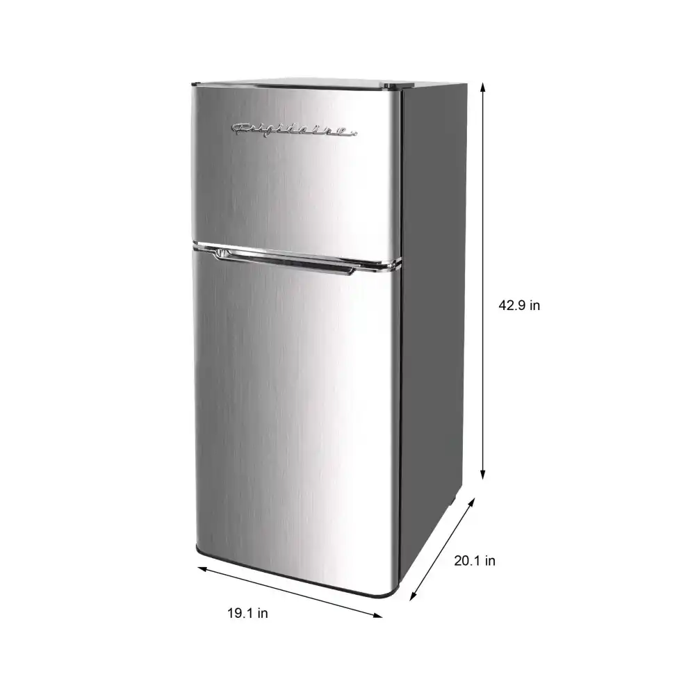 The Retro Platinum Frigidaire 4.5 cu. ft. compact Refrigerator with chrome trim is roomy enough for your groceries but small and sleek enough to fit almost anywhere. This model features a top-mount full-size freezer with manual defrost and storage door. Slide-out shelves provide efficient storage options and add to their unique style. Designed for energy efficiency. The flush-back design and door handle offer a clean and retro appearance that looks great in your home, in a dorm, or at the office. The Frigidaire retro appearance looks great in your home, in a dorm, or at the office.
