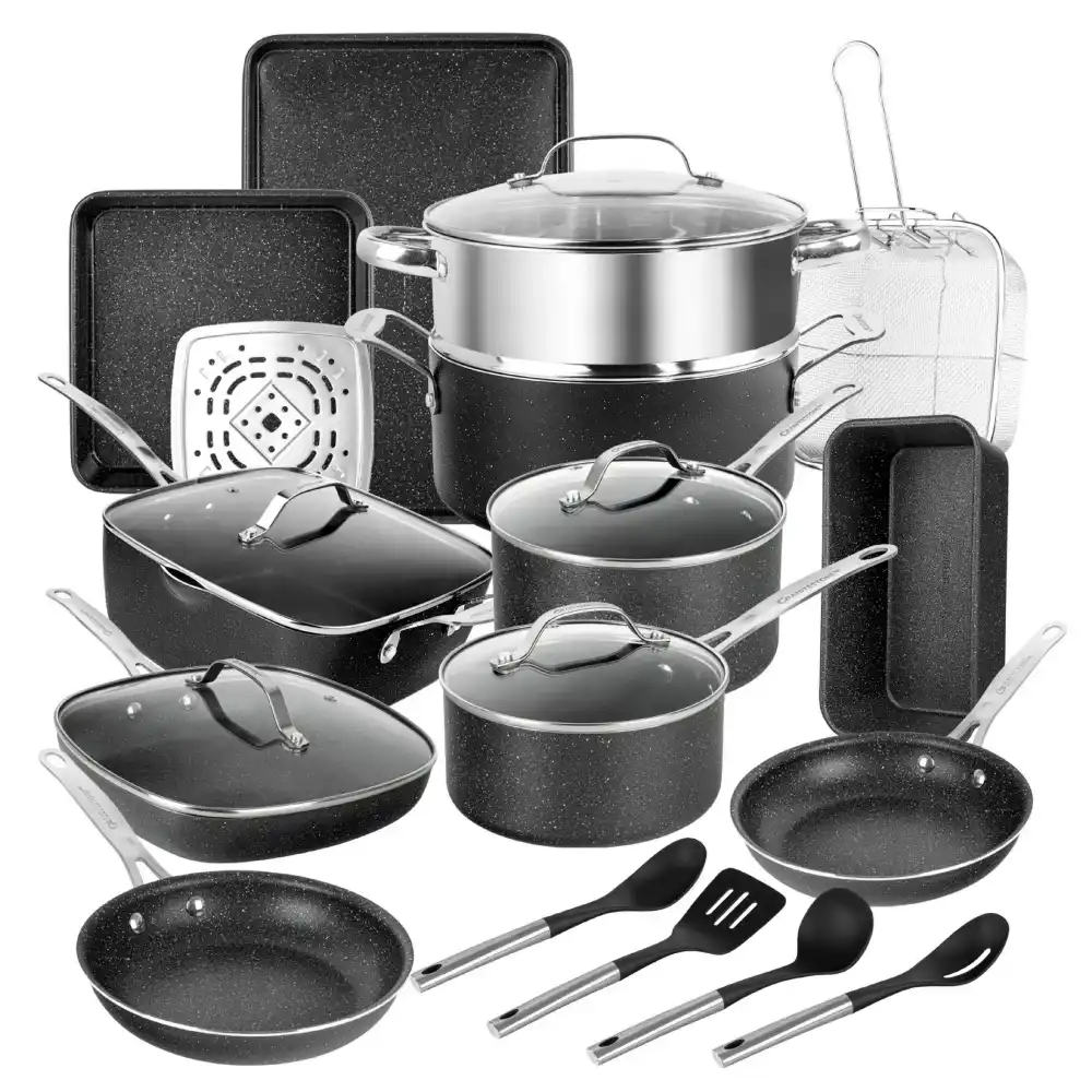 Pioneering Granitestone cookware features a mineral-infused granite coating that is the perfect blend of nonstick, durability and ease of use. The pans’ sleek and modern speckled exterior with neutral tones will match any kitchen decor. Cleanup is a breeze too and the pans will look new even after years of use.