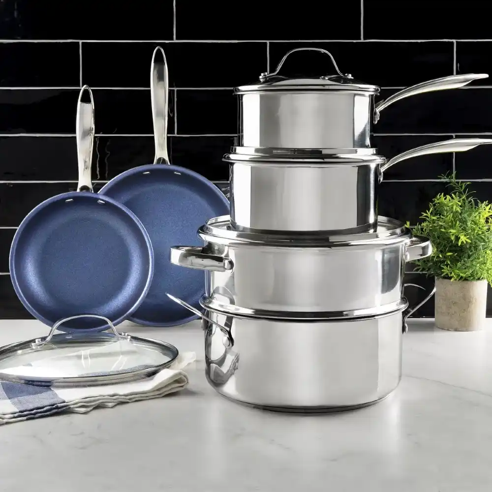 - ULTRA NONSTICK PERFORMANCE – the Granitestone Blue coating ensures natural stick resistance, and prevents food from picking up a metallic taste, is free of all harmful chemicals including PFOS, lead and cadmium while its polished stainless-steel exterior offers exceptional beauty in the modern home.