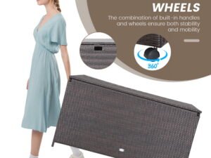 - Hassle-free Movement: Featuring 2 universal wheels which are smooth,non-slip and quiet,this outdoor storage container is convenient for you to move wherever you want,such as patio,garden,backyard or poolside. And the built-in handles on both sides make movement easier.