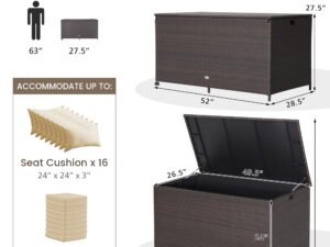 - 133 Gallon Storage Capacity: This outdoor storage box features 133gallon inner capacity,which can store multiple back cushions and seat cushions at once. In addition to storing cushions,it can accommodate blankets,gardening tools and sports equipment as well.
