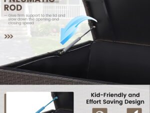 - Pneumatic Rod for Safety: This garden deck bin is equipped with the premium pneumatic rod with the sturdy triangular structure that is convenient for you to open and close the lid. Meanwhile,it is child-friendly because the pneumatic rod can slow the speed of closing. When the lid is closed,this outdoor storage box serves as a side table thanks to its multifunctional design.