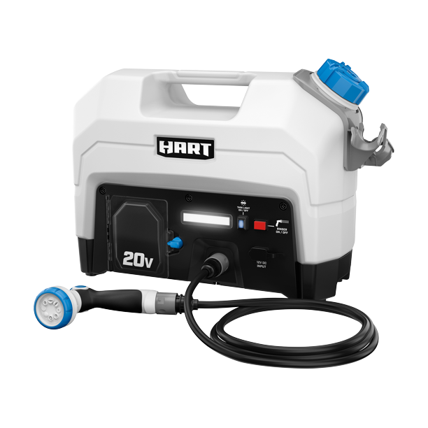 Are you in need to clean something far from the convenience of an electrical hookup? No problem, that’s why we created the HART 20V Portable Rinser. This tool can be powered by a 12V DC car outlet or a HART 20V battery for on-the-go cleaning. It does a great job cleaning hands, washing dishes while camping, washing off beach supplies, washing hands, and more; all without the fear of too powerful of a spray. With 8 different spraying patterns to choose from, it is nice to be able to switch between a gentle shower of suds to a more powerful clean water spray. Our rinser even holds its own water with a built-in 5-gallon water tank for maximum portability. The on-board LED light provides increased visibility when washing at night or in a dark space. And with HART’s 20V Lithium-ion battery, you can expect up to 38 gallons per charge! The fact that it is compact and lightweight makes it easy to handle and easy to store. Includes (1) Rinser, (1) 8’ 12V DC power cord, (1) 20’ hose, (1) a multi-nozzle head, (1) 2.0Ah Lithium-ion battery, (1) charger and operator’s manuals.