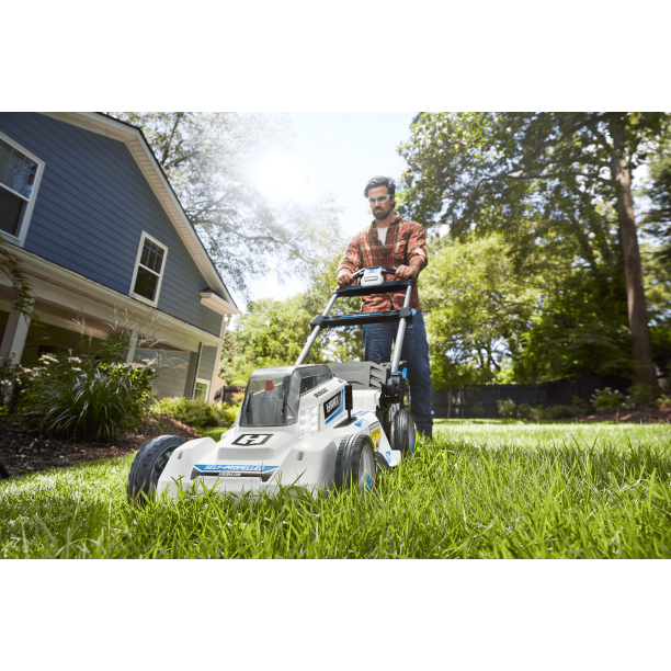 The 20-inch Brushless Self-Propelled Mower is ideal for yards up to 1/2 acre in size. Without the hassle of a pull cord, start your mower with the push of a button. Brushless technology provides consistent power without bogging down, and extended motor life for many seasons to come. Variable speed self-propelled technology is a great option for yards with slopes and hills. Height modifications are easily made with a single-point height adjustment (1 ½-inch – 4-inch) instead of adjusting each of the 4 wheels individually. On-board battery storage carries two batteries at once which allows you to continue mowing when one of your batteries runs out of power. For compact and easy storage in your garage, this mower is equipped with telescoping and folding handles. Choose how you want to mow with bagging or mulching capabilities. All a part of the 40V System where you get ALL POWER, NO GAS. Includes 20-inch brushless self-propelled mower, (1) 5.0Ah battery and charger.