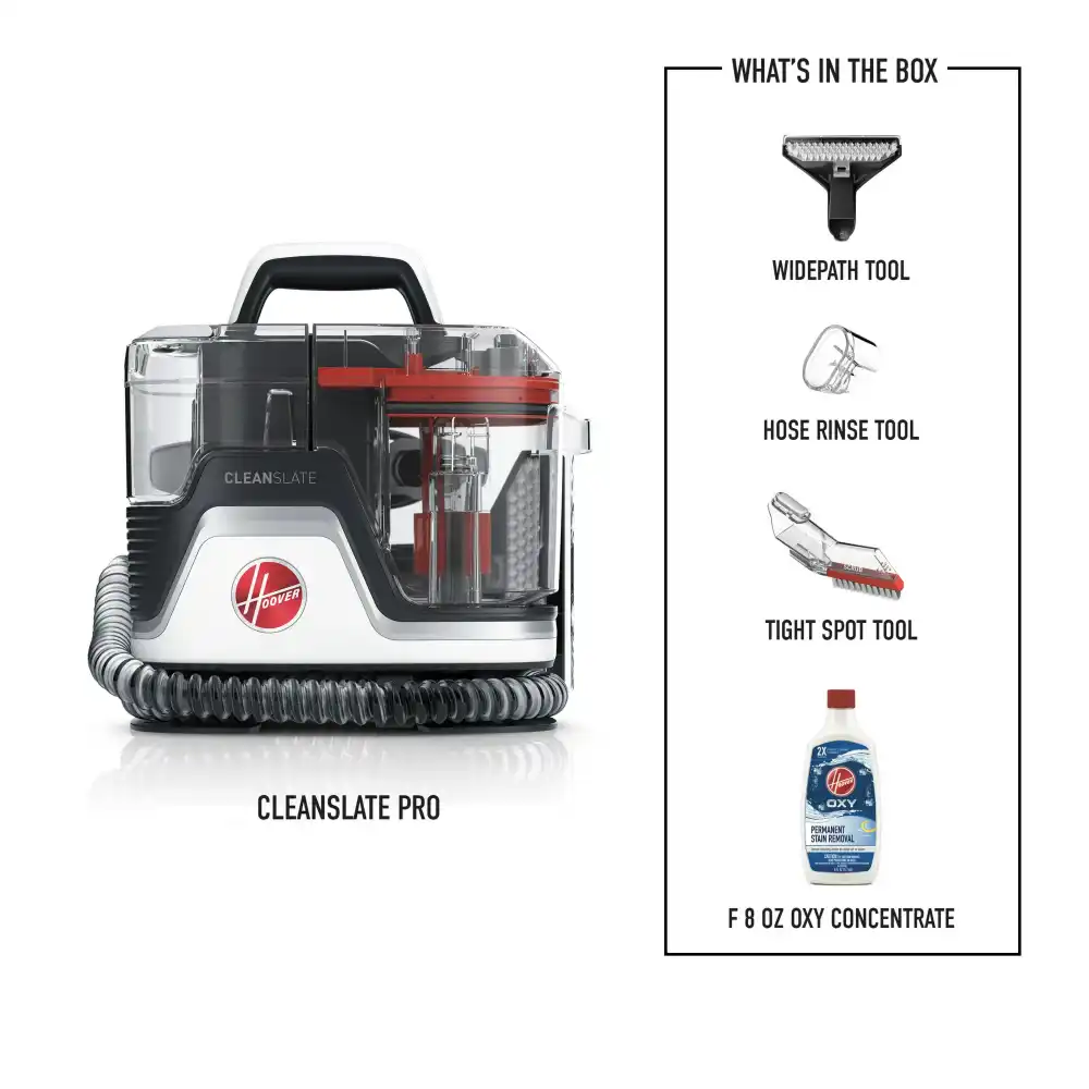 Unplanned messes? No problem. The Hoover CleanSlate Carpet and Upholstery Pet Spot Cleaner, FH14010, combines powerful suction, versatile tools, and the performance of the Oxy Formula to permanently remove stains and messes. With our 7″ WidePath Tool for large areas like stairs and the TightSpot Tool for crevices and tough to reach areas, you’ll have the flexibility you need to clean messes of any size. Quickly remove spills and stains on the go thanks to a light, portable design and a long cord so you can easily move between areas. And with the Hose Rinse Tool, your machine stays clean and ready for the next mess. Clean with complete confidence!