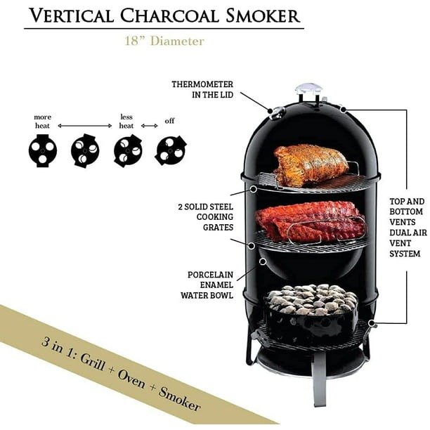 - MULTIFUNCTIONAL- you will be able to put all your cooking skills to work with this high quality 18 inch 3 in 1 product that works as a grill, oven and smoker built with Porcelain enamel water and charcoal bowls for it to last.