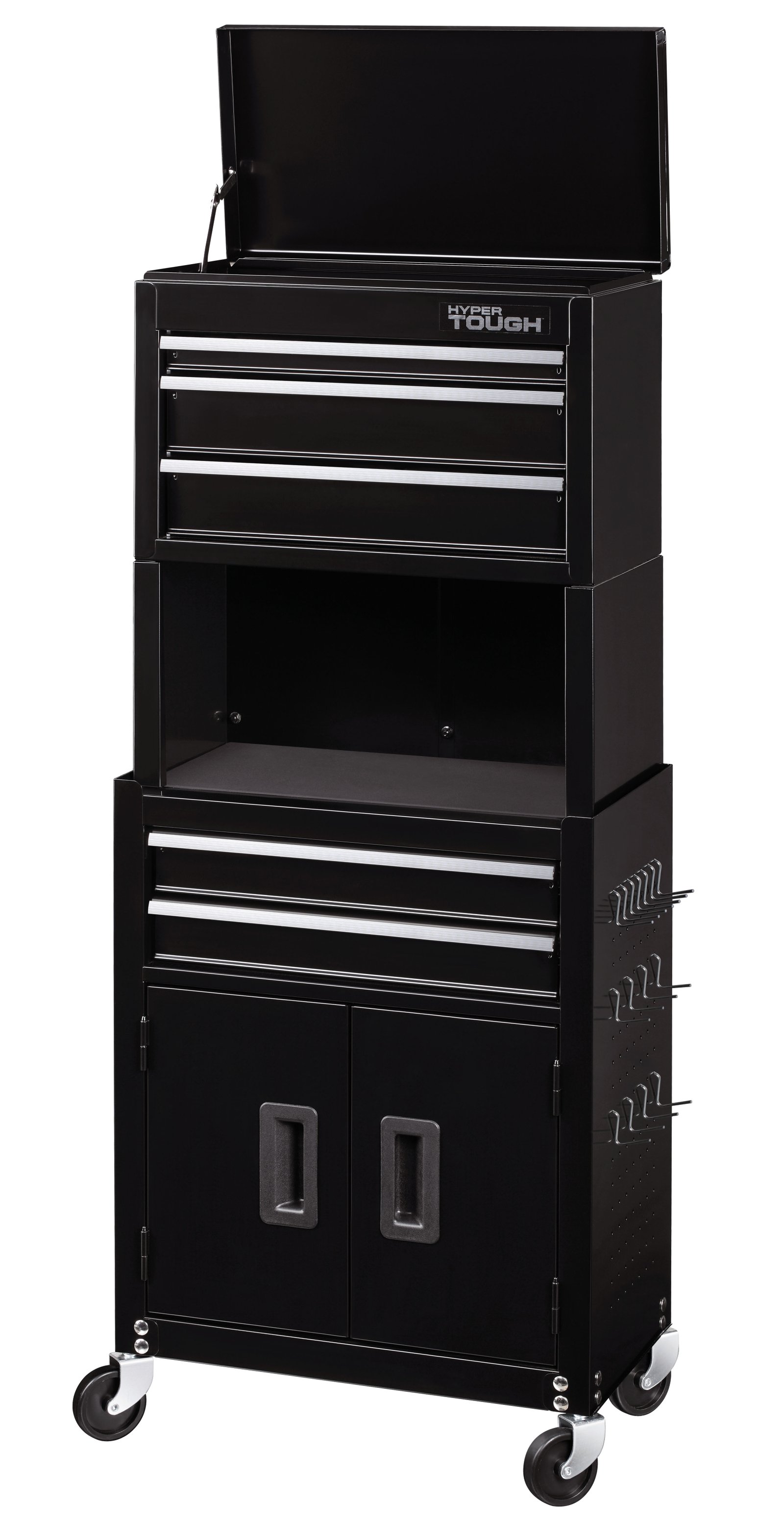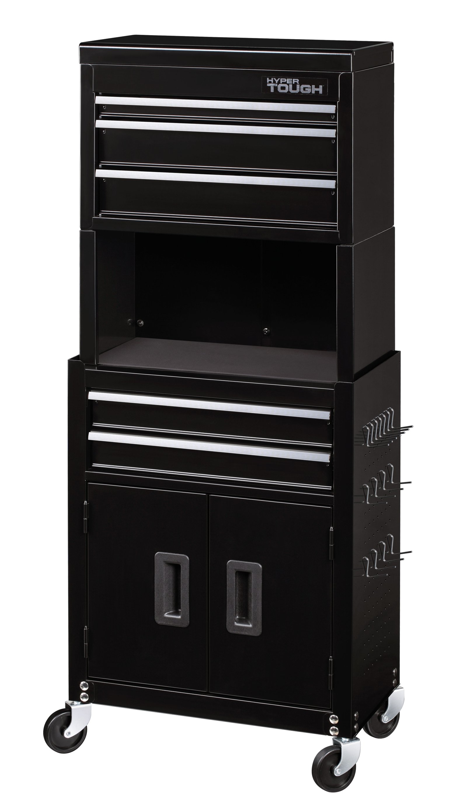The Hyper Tough 20-Inch 5-Drawer Tool Chest and Cabinet Combo with Riser provides many great storage options. The top chest has three drawers and an accessible top tray. Inside the top tray is an electrical knockout that will allow you to run an electrical cord within. The lower section has two additional drawers and a bulk storage area with two doors for larger items. In between the two sections is a 9.5-inch riser that provides additional storage space. All drawers have ball-bearing drawer slides which allow them to open and close easily and effortlessly. The side panels of the lower section have pegboard holes in them to create quick access to frequently used tools. Fifteen peg hooks have been included with this unit. The entire chest and cabinet combo can move around your workspace on the four swivel casters. Be sure to add this rolling tool storage combo to your workspace today!HyperTough 20-In 5-Drawer Rolling Tool Chest & Cabinet Combo w/ Riser