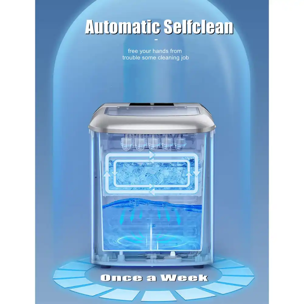 - DESIGNED WITH CARE – Advanced water reuse system allows the water from the melted ice to be recycled and turned into ice again, saving water. A thick foam layer effectively insulates heat, saving energy. Comes with the most powerful and stable compressor and quiet DC fan for a faster cooling effect, low consumption, and a low noise level under 35dB.
