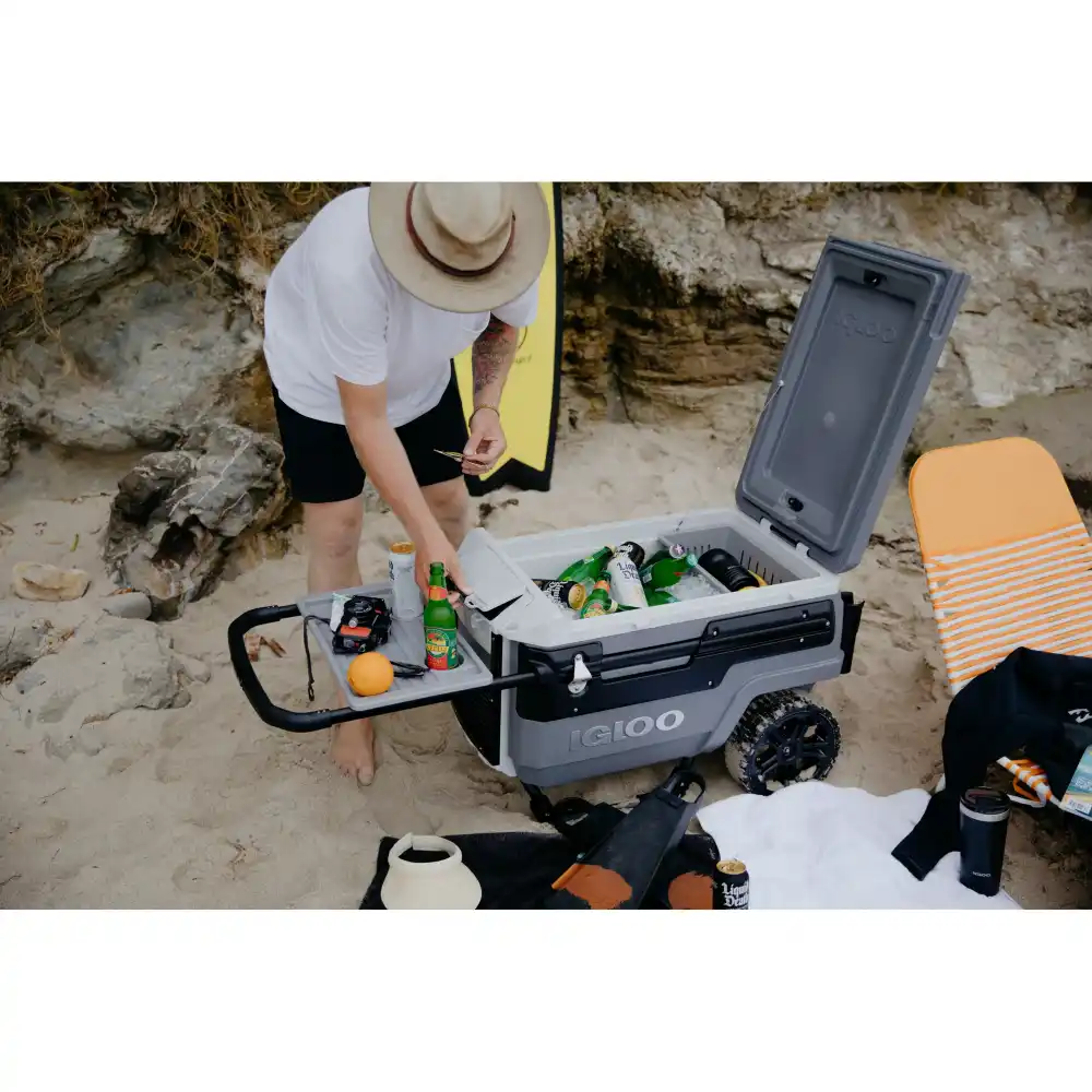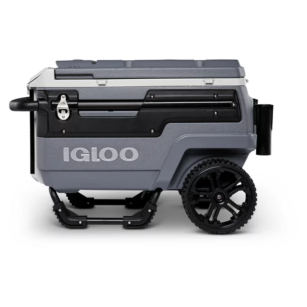 - 70QT Igloo Trailmate Cooler tackles sand & other challenging terrain with the superior traction & ground clearance of 10-inch, never-flat, smooth-ride wheels