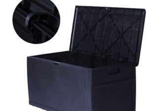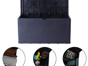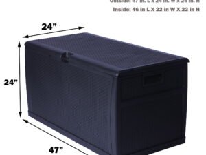 Karmas Product Deck Storage Box is oversized with a 120-gallon storage capacity. With rattan finish, it blends perfectly with most modern patio decor and furniture. The outdoor deck box, made with high-quality plastic, is durable and sturdy enough to withstand bad weather conditions. You can put summer cushions, pillows, and big toys inside with confidence. Quick Assembly, No tools required. To attach the front to the side first, then the bottom panel. Inside, 46 in L X 22 in W X 22 in H. Large Capacity 120-Gallon perfectly store summer cushions, kids toys, garden supplies, odds, and ends. Weather-Resistant Design keeps inner dry, Handles on sides for easy movement. The Flat Lid provides a spacious bench surface for food serving and is sturdy enough for one adult seating. Plastic-Made Rattan Finish matches well with most patio furniture and decor, fashionable and functional.