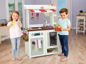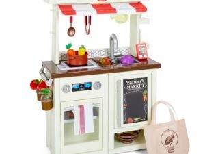 The Little Tikes First Market Kitchen combines tons of interactive role play with the great modern rustic aesthetic of a farm-to-table kitchen, complete with fabric canopy. This realistic pretend play kitchen has a light-up stovetop, working fridge & oven doors, and more features that encourage hours of imaginative role play. It’s designed for easy cleanup and storage too; there’s tons of built-in storage space and hanging hooks to house the 20+ included pretend cooking accessories. Kids will love cooking up a storm with the First Market Kitchen by Little Tikes!