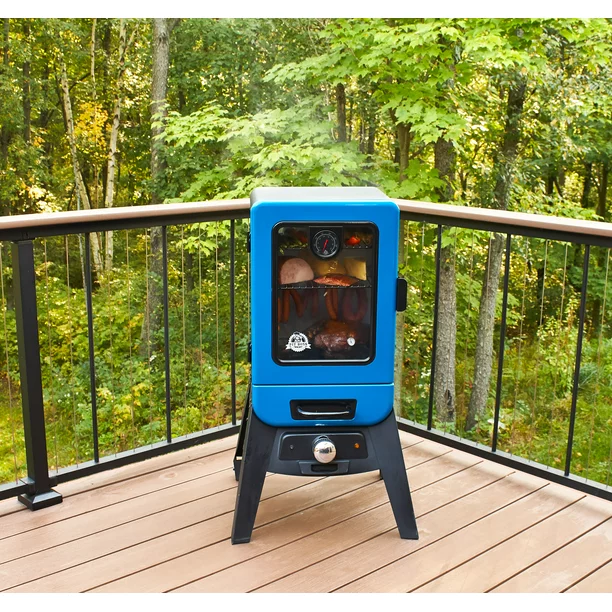 Become the pitmaster of your backyard with the Blue Blazing Wood Chip Vertical Electric Analog Smoker from Pit Boss. This electric smoker provides the convenience and temperature control of your oven outside with a smoking temperature range of 150 to 325 degrees Fahrenheit thanks to the double-walled cabinet, 1650 watts of power, and analog controls that remove the need to plug and unplug any components during the smoking process. With the capacity for family dinner or a neighborhood cookout, the 4 porcelain-coated grids provide 593 square inches of cooking surface. Create the exact result you’re looking for without interrupting the process using the large viewing window to keep an eye on the job from start to finish and the oversized external-loading porcelain-coated water and wood chip bin to create unforgettable flavors and textures. With an analog meat probe and door thermometer, you can set it and forget it while maintaining control and precision, whether making a pizza, rack of ribs, or anything in between. Whether you’re new to smoking or already an expert, cook up barbequed perfection with ease and confidence using the Blue Blazing Vertical Electric Analog Meat Smoker from Pit Boss.