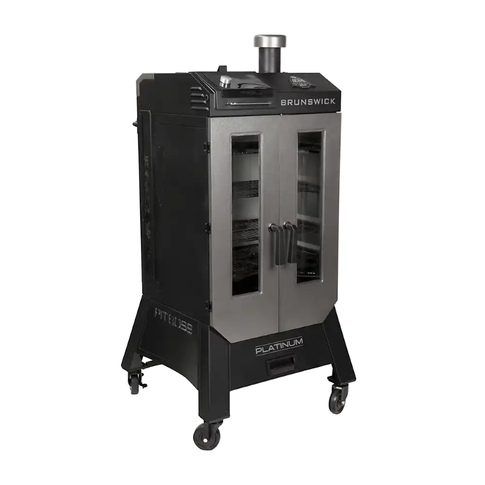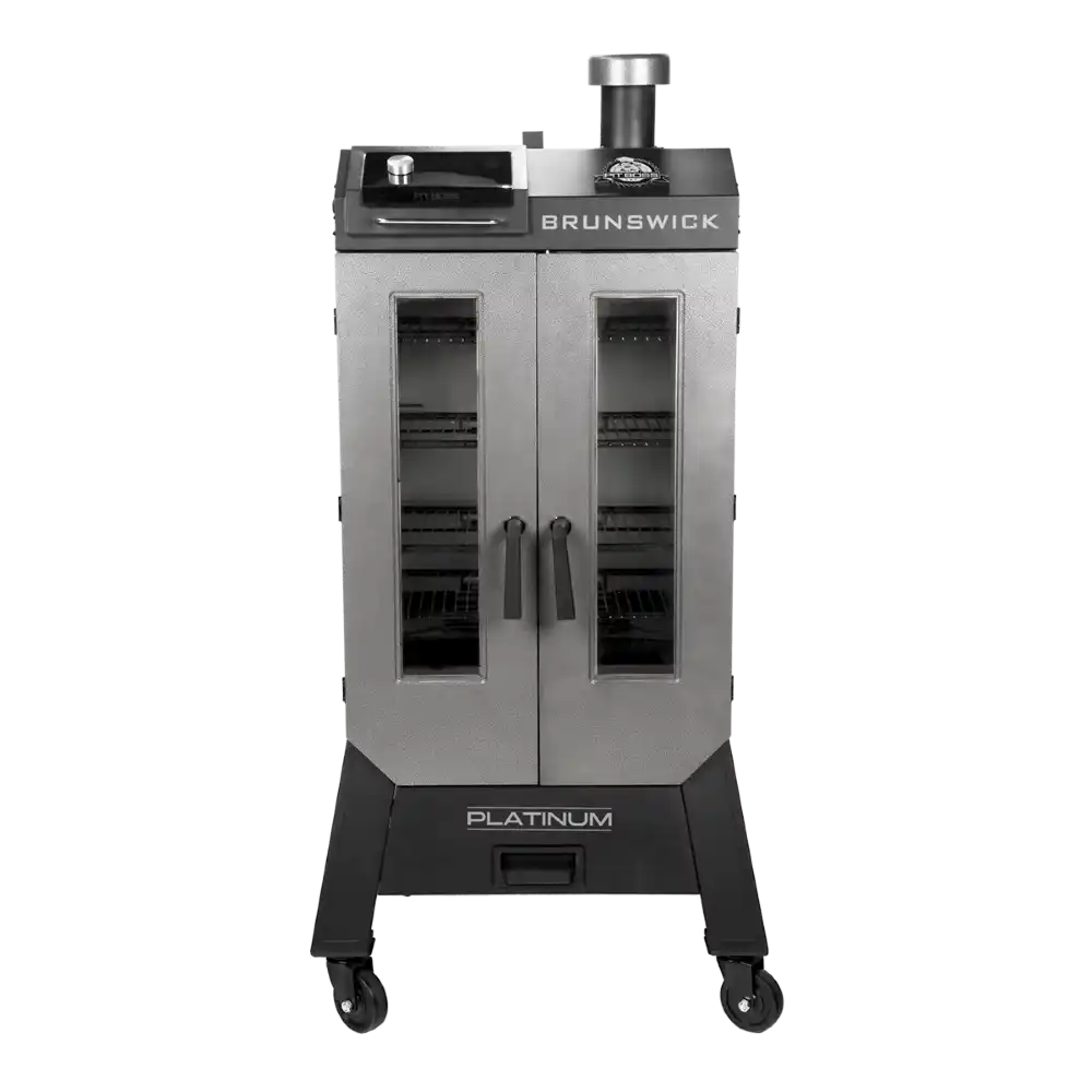 Experience incredible 5-in-1 versatility combined with the award-winning flavor of 100% all-natural hardwood pellets. Smoke, bake, braise, roast, and barbecue and get bold and juicy results every time. The Brunswick Platinum Vertical Smoker available exclusively at Walmart also features more than 1,160 sq in. of cooking surface, four adjustable porcelain-coated racks, a powerful temperature range of 150° to 420° F, built-in lighting for night-time smoking, quick-access ash cleanout tray, and two stainless-steel meat probes that send internal temperature readings directly to your phone and smoker.