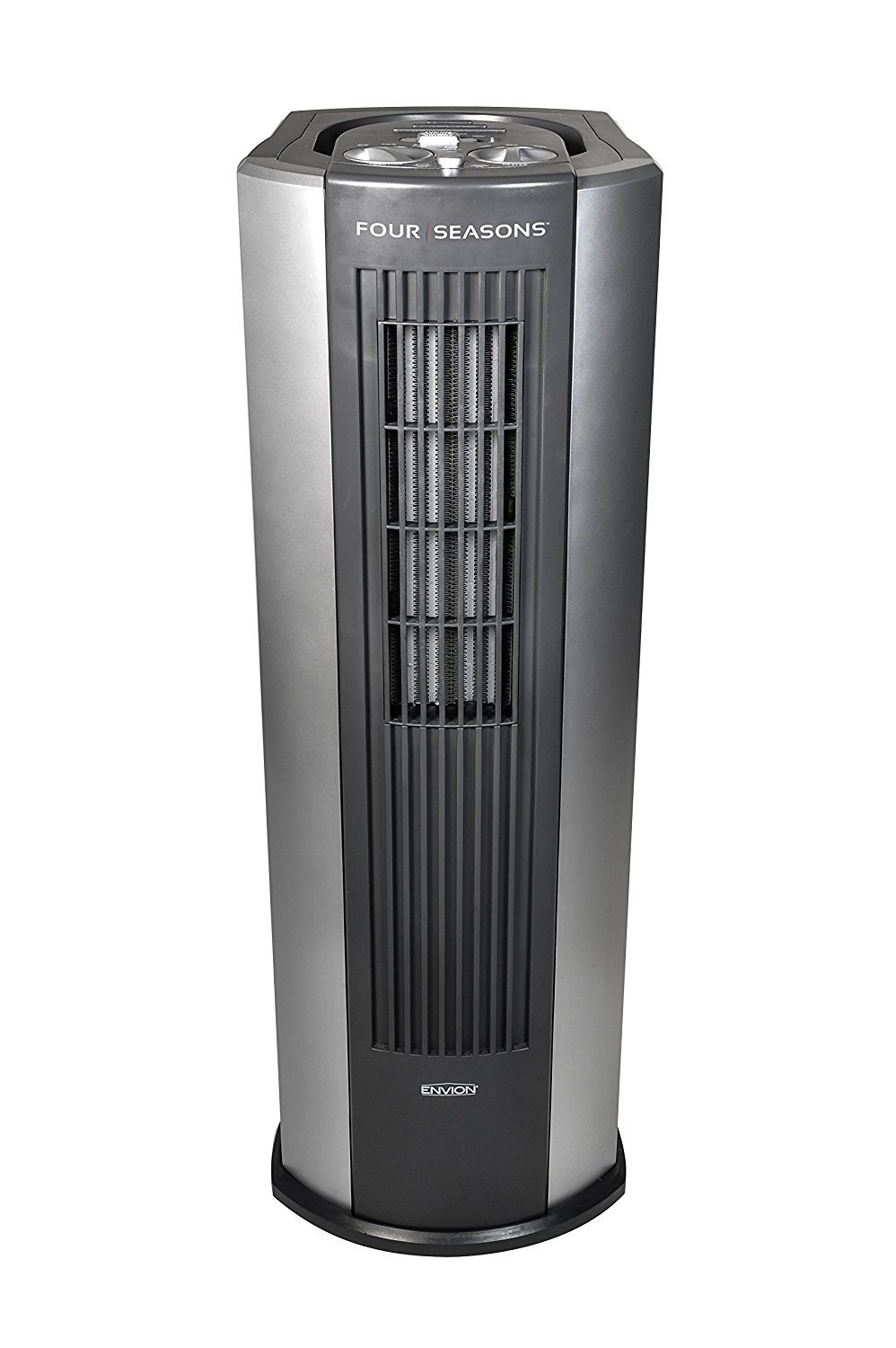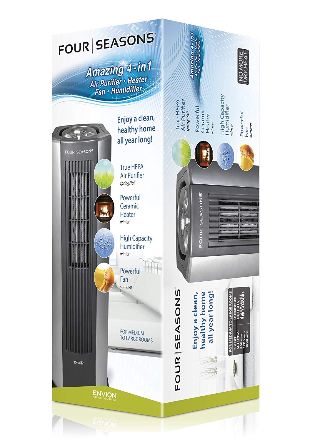 Enjoy the peace and satisfaction of clean, pure air with the Envion FS200 Four Seasons Air Purifier, Heater, Fan & Humidifier. Combining true HEPA filtration and unique, powerful engineering, this one-of-a kind product features a heater, humidifier, fan and air purifier – all built into one space-saving machine, so your family can enjoy the warmth of an adjustable electric heater without drying out your skin or the air around you. With 3 heat settings, this electric air cleaner generates healthy, moist heat, or a clean cool breeze in medium to large rooms. The True HEPA filter removes mold, mildew, smoke, viruses, germs and pet dander. This is the perfect product to keep your home pure and comfortable all year long!