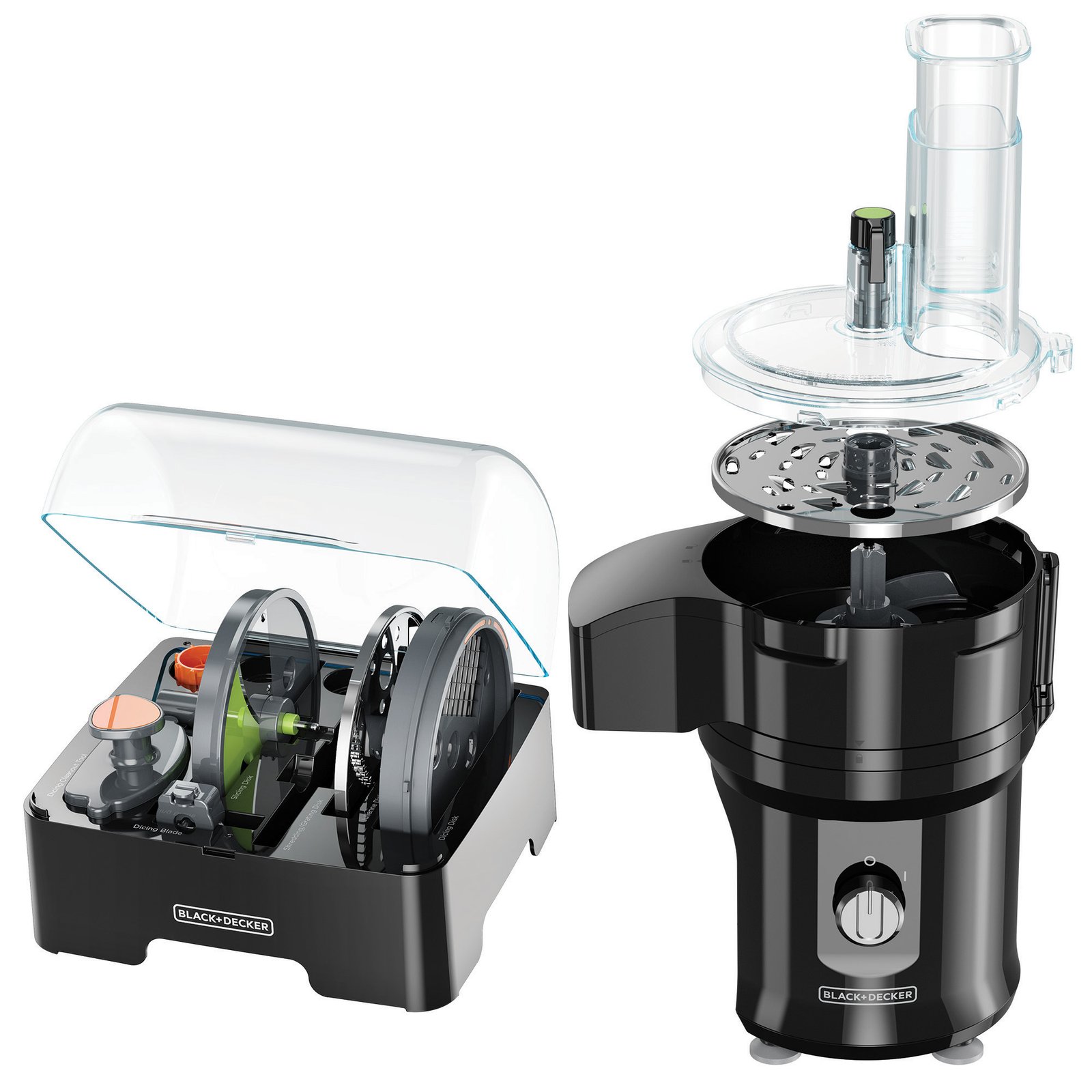 Depend on BLACK + DECKER? to handle time-consuming kitchen tasks. The MultiPrep? Slice ?N Dice? All-In-One Cutting Appliance saves you time and effort with six cutting functions: dicing, slicing, julienning, shredding, grating, and cutting. Just imagine all the recipes you?ll create when professional-style dicing is done for you! Plus, you can adjust the thickness of slices on the fly with the external level control. The sturdy cutting discs attach easily to the motor assembly, and a sweeper arm guides food through the chute into your work bowl. All removable parts are dishwasher-safe, and the cutting discs fit nicely into the compact storage case, which comes with a hinged lid. The MultiPrep? gives you so many options in the kitchen. What will you make?