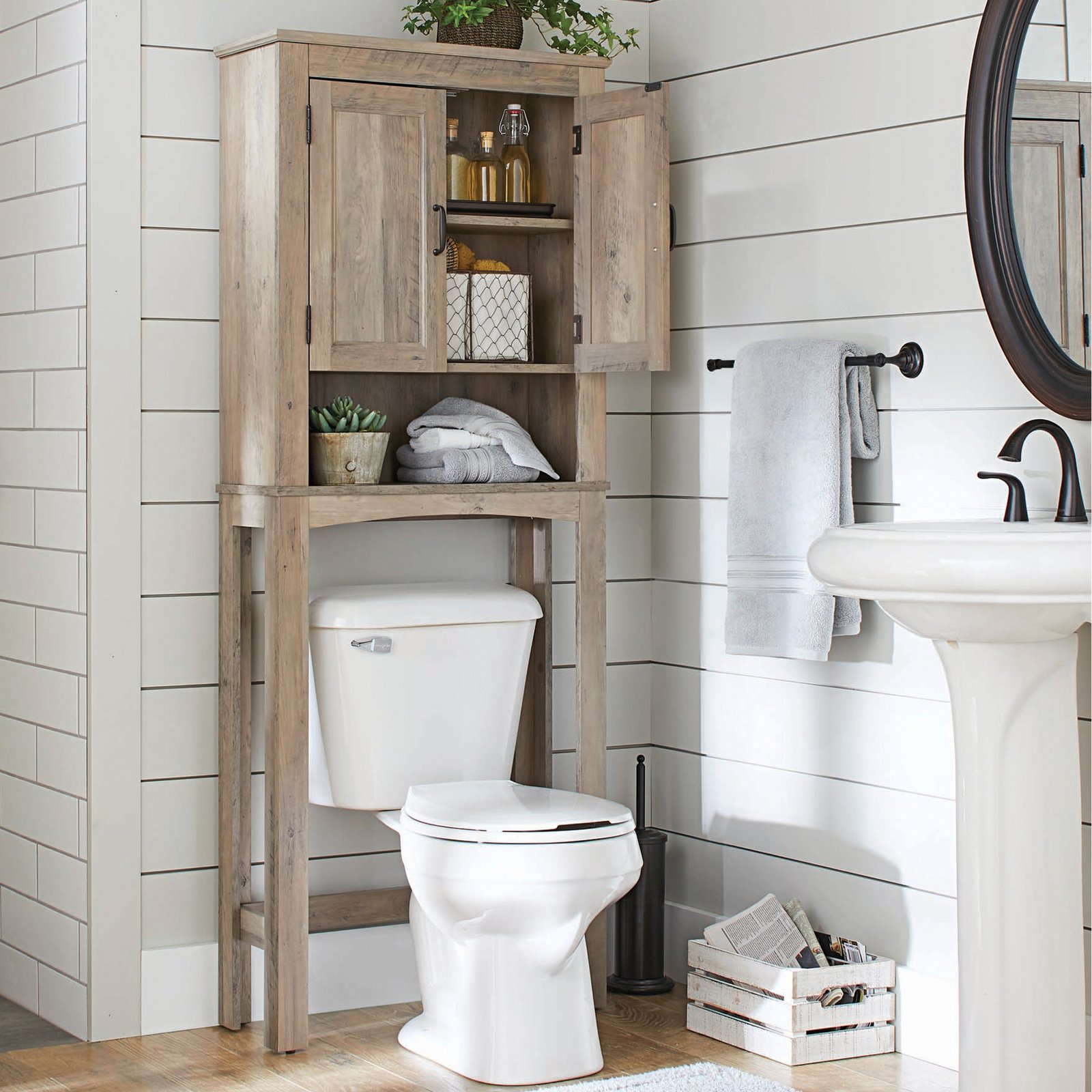 The Better Homes & Gardens Over the Toilet Space Saver provides a savvy storage solution for any bathroom with limited room. Part of the Northampton collection, this space saver fits over most standard toilets to add room for towels, toiletries, decorative accessories and more. The sturdy space saver includes a two-door cabinet with an adjustable interior shelf, plus an open shelf below. The Rustic Gray Finish will complement most bathroom decor choices. The space saving unit is easy to assemble, and includes durable, color-coordinated hardware. Use the space saver on its own in any bathroom, or pair it with coordinating items from the Northampton collection. Please refer to anchoring instructions for safety concerns. Call customer service at 1-800-892-3986 for further assistance.