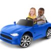 Sleek, sport car style ride-on toy is great for driveway and sidewalk adventures., Working headlights and horn and engine sound effects add to the playtime fun., Crank up the tunes with the FM radio and MP3 input., Real foot pedal acceleration creates a lifelike driving experience., Goes forward at 2 MPH, with a top forward speed of 4 MPH., Power Trax rubber traction strip tires keep the ride smooth and steady., One Step Direct Connect Charging System for easy, no-fuss charging., Includes 12-volt rechargeable battery and charger so the fun never has to stop for long., Seats two riders, ages 3 – 7, with a maximum weight of 90 lbs.