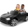 Sleek, sport car style ride-on toy is great for driveway and sidewalk adventures., Working headlights and horn and engine sound effects add to the playtime fun., Crank up the tunes with the FM radio and MP3 input., Real foot pedal acceleration creates a lifelike driving experience., Goes forward at 2 MPH, with a top forward speed of 4 MPH., Power Trax rubber traction strip tires keep the ride smooth and steady., One Step Direct Connect Charging System for easy, no-fuss charging., Includes 12-volt rechargeable battery and charger so the fun never has to stop for long., Seats two riders, ages 3 – 7, with a maximum weight of 90 lbs.