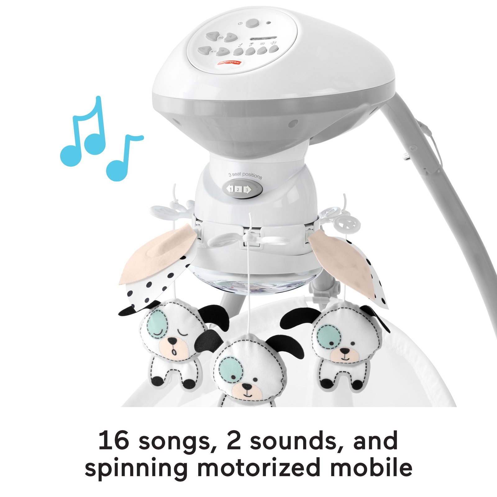 - Adorable, puppy-themed infant swing that gently rocks side-to-side or head-to-toe