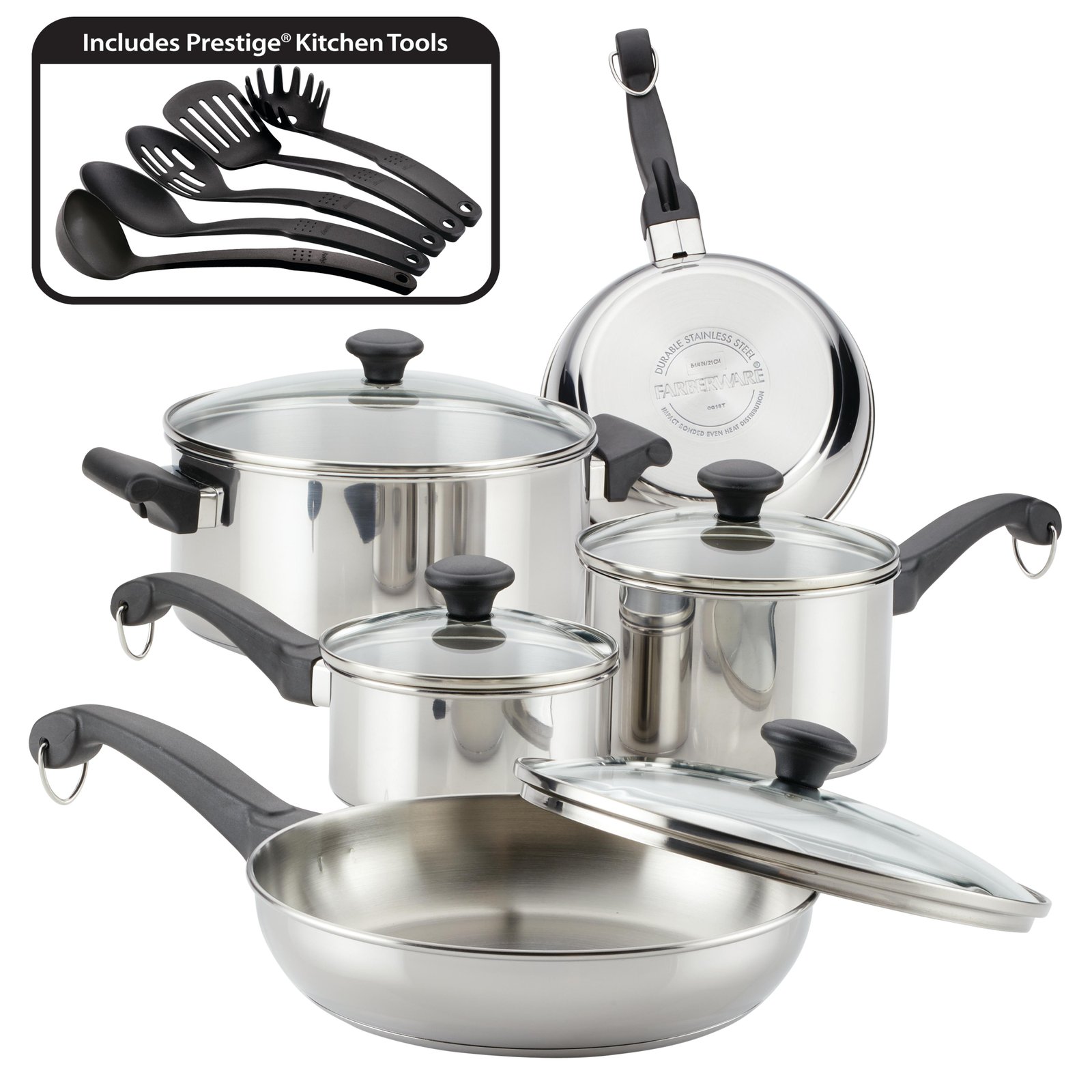 Timeless tradition meets cutting edge technology in the Farberware Classic Traditions 14-Piece Stainless Steel Cookware Set. This collection of cookware essentials features traditional bell-shaped profiles with mirror-polished stainless steel exteriors to deliver a radiant touch of kitchen style, and the frying pans boast the innovative ProSear Technology embossed surface for superior searing, enhanced browning, and easy food release. A full cap base ensures fast, even heating on all stovetops, including induction. Shatter-resistant glass lids let you watch foods cook while sealing in heat and flavor, and the complete set is dishwasher safe for effortless cleanup. Oven safe to 350°F, this stainless steel pots and pans set comes with five Prestige kitchen utensils, including a slottted turner, slotted spoon, solid spoon, fork, and ladle so you can get going on your favorite family recipes right away. For classic style with innovative cookware technology, get set with a full 14-Piece set of Farberware Classic Traditions Stainless Steel Cookware.