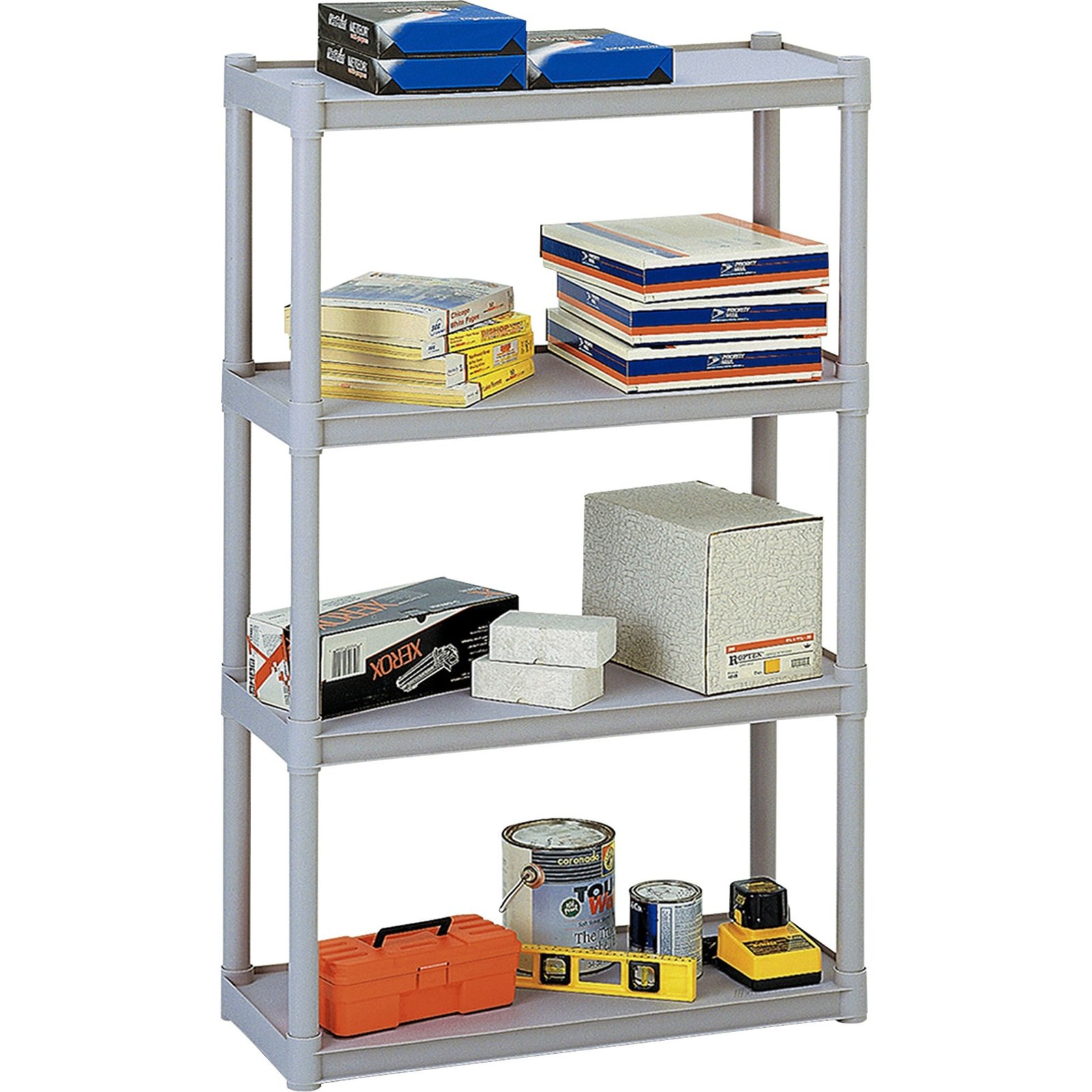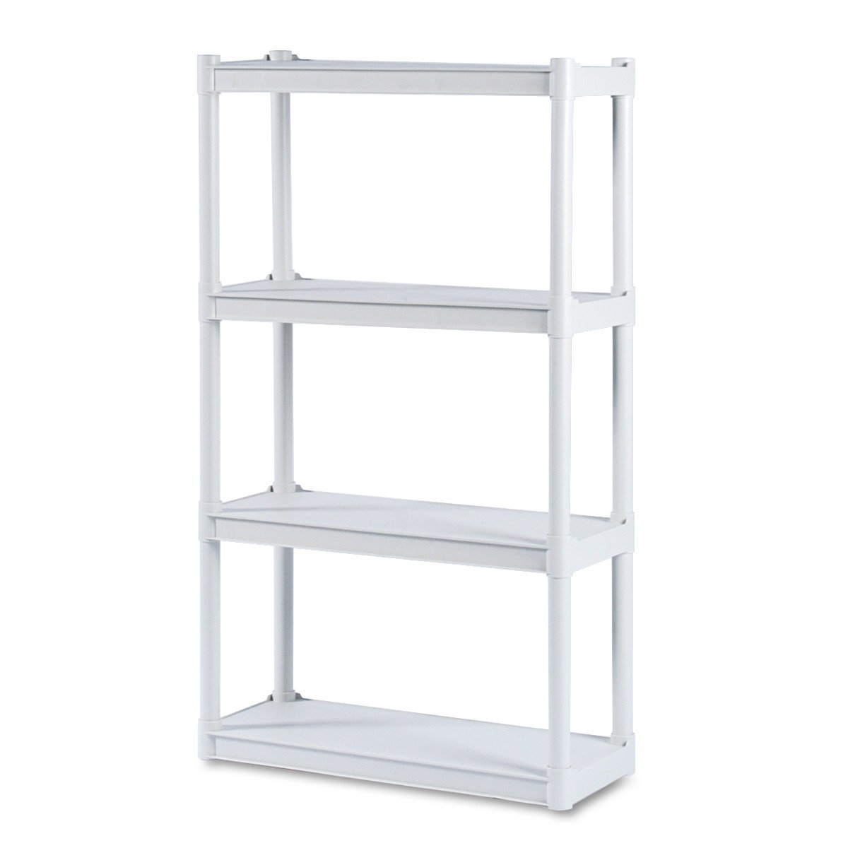 Four-shelf Open Storage System offers sturdy storage space. Heavy-duty upright offers increased stability and holds 75 lb. per shelf when evenly distributed. Constructed of injection-molded polypropylene, storage system won’t scratch or dent. Easily snap it together.Iceberg Rough ‘N Ready 4-Shelf Open Storage System, Platinum