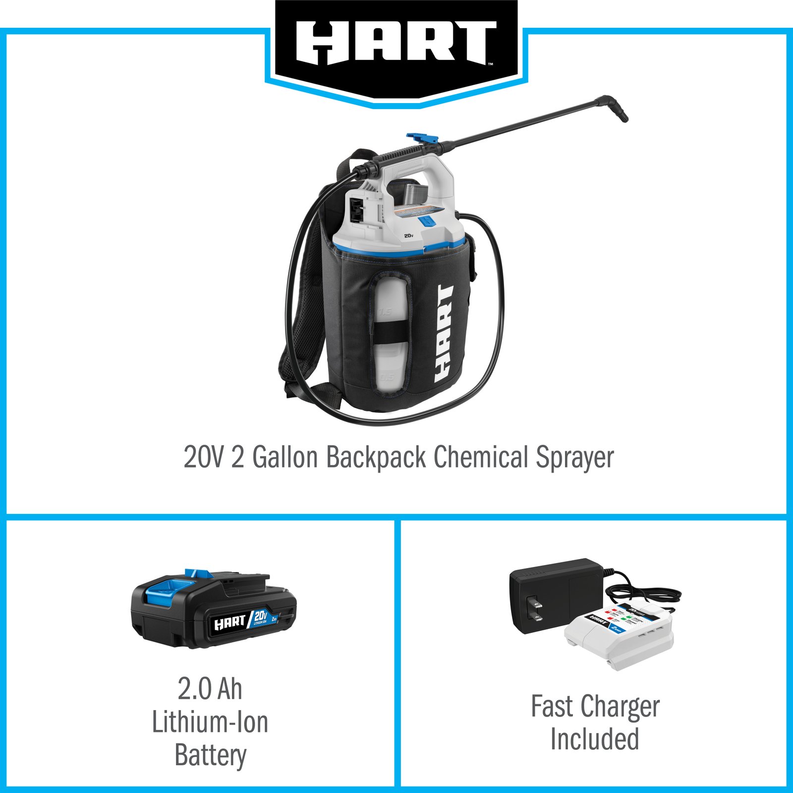 Keep your yard free of insects, mold and weeds with the HART 2-gallon chemical sprayer. No pumping required; the 2-gallon chemical sprayer is a great alternative to a manual chemical sprayer. Includes an on-board measuring cup and adjustable nozzle for user convenience. Either carry the sprayer by hand or us it as a backpack with the included holster. Up to 40 gallons per charge. Includes 2-gallon chemical sprayer, backpack holster, hose, adjustable spray wand, measuring cup, (1) 2.0Ah battery, and fast charger.