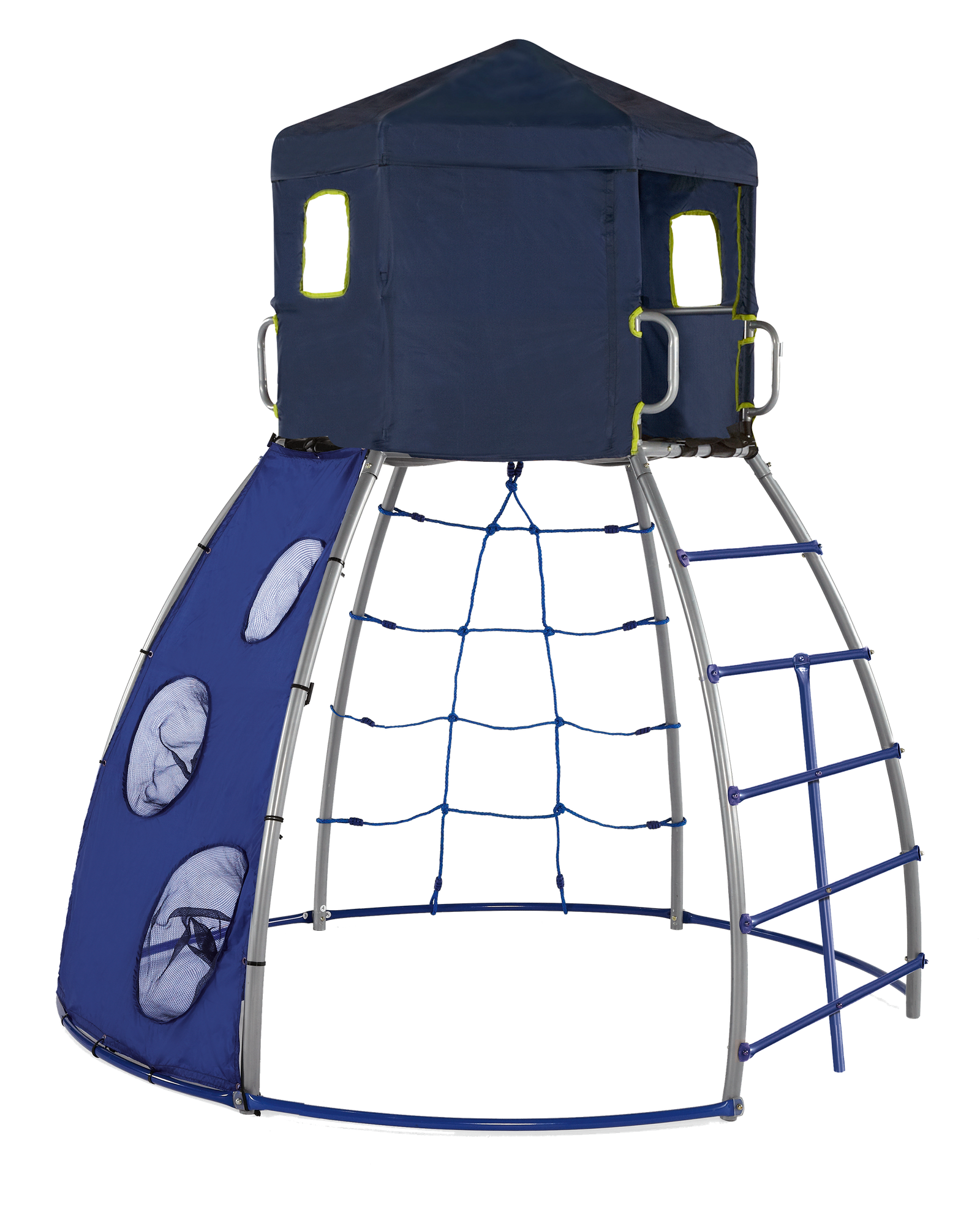 - Features climbing rungs, cargo scramble net, target wall and play platform with fabric roof