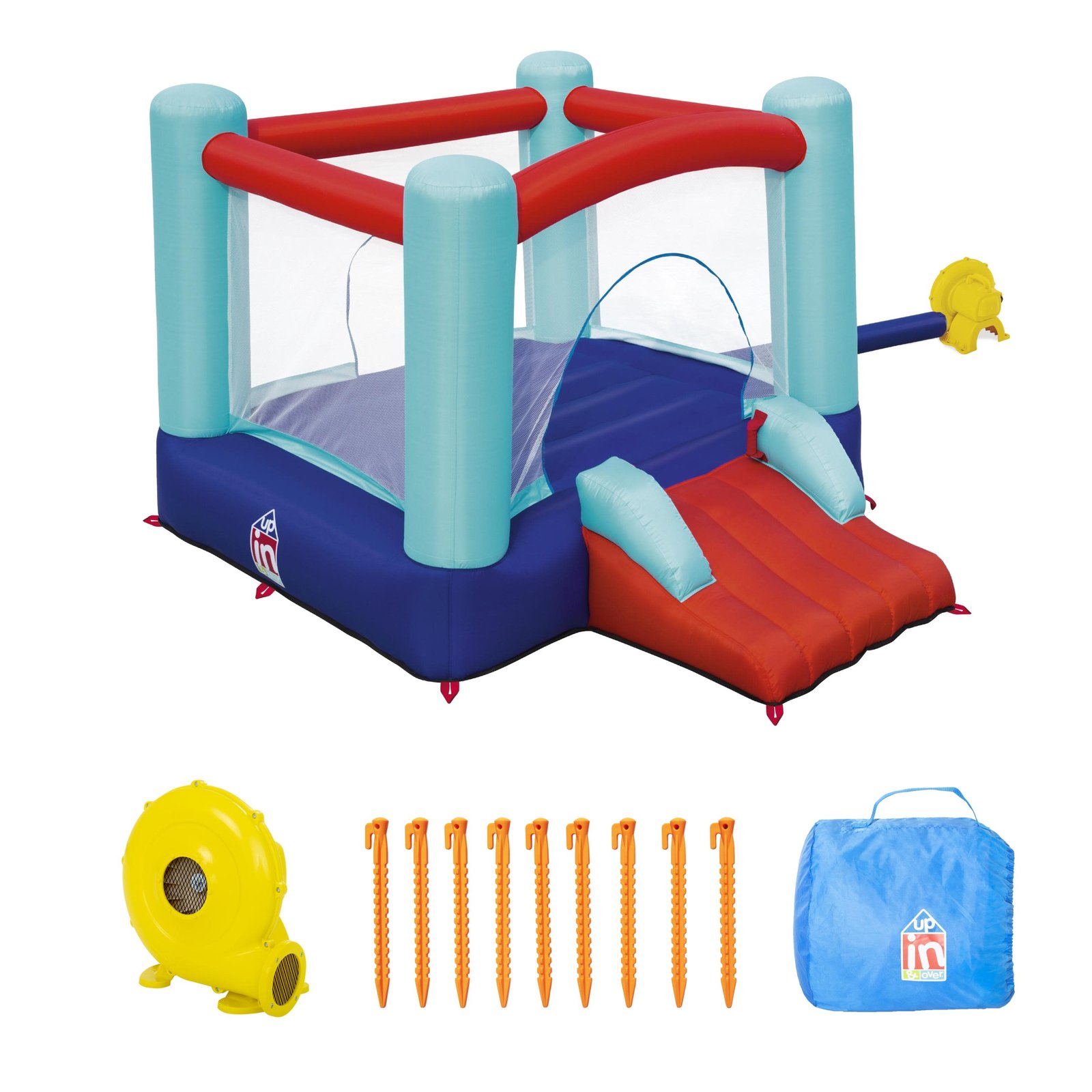 - Includes blower (110-120V), repair kit, storage bag, stakes for bouncer and blower