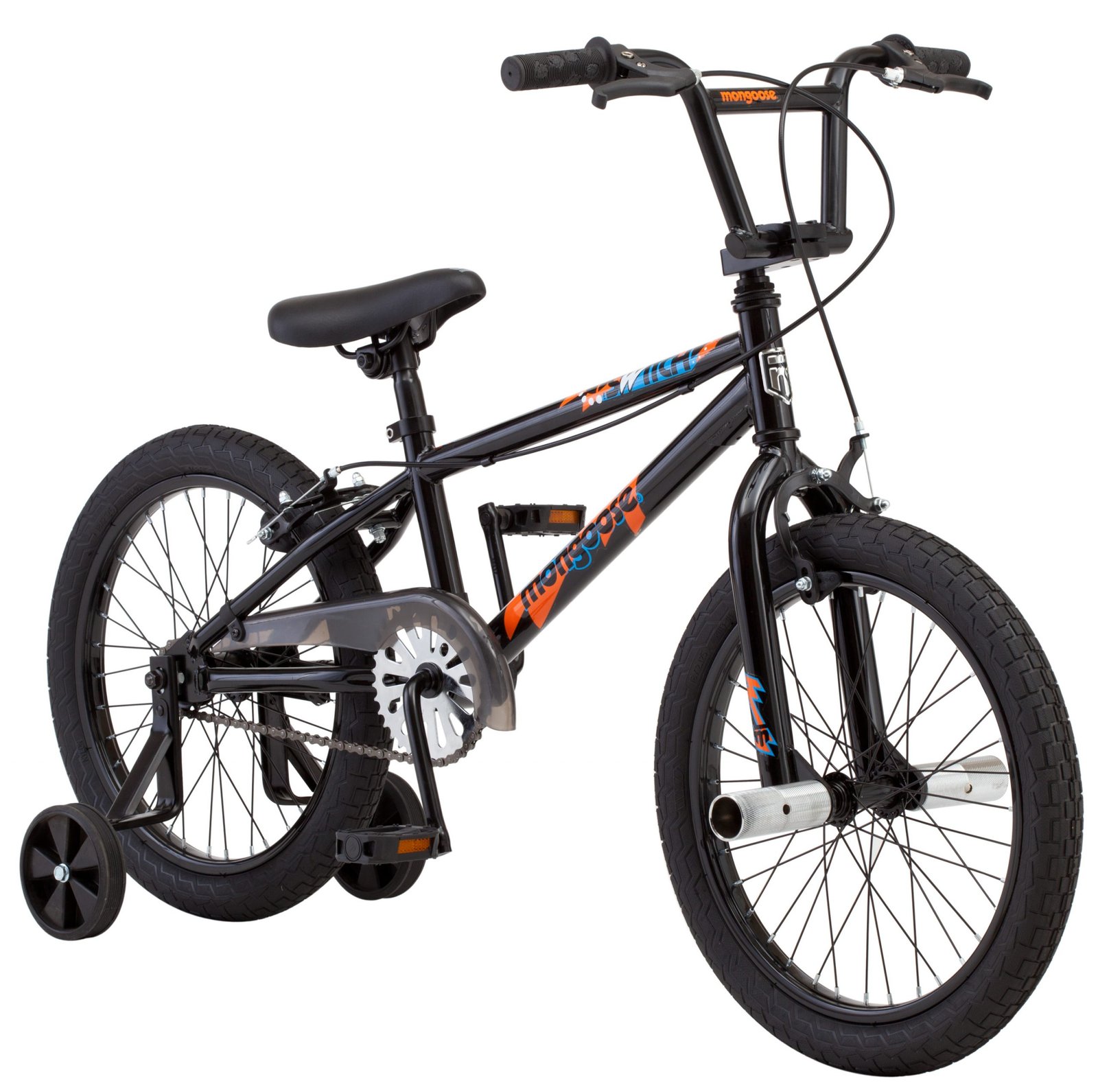 Your child will have countless hours of fun riding this 18″ Mongoose Switch Boy’s Freestyle Bike. It has a heavy-duty, non-corrosive scaled-down, lightweight steel frame, that allows young kids to get their first experience at riding like the pros. This 18″ freestyle bike has front and rear handbrakes, as well as a coaster brake for easy stopping. It also has training wheels that you can remove once your child masters his skills and holds and steers the bike on his own. This 18″ Mongoose Switch Boys Freestyle Bike comes with a single drive train and standard pedals. The padded seat offers comfort and the stylish design makes it fun to ride. Countless hours of fun await with the Switch Freestyle. Become your own legend with Mongoose. Great news! If you select Site to Store delivery, you can call your local store as complimentary assembly may be offered at that location.