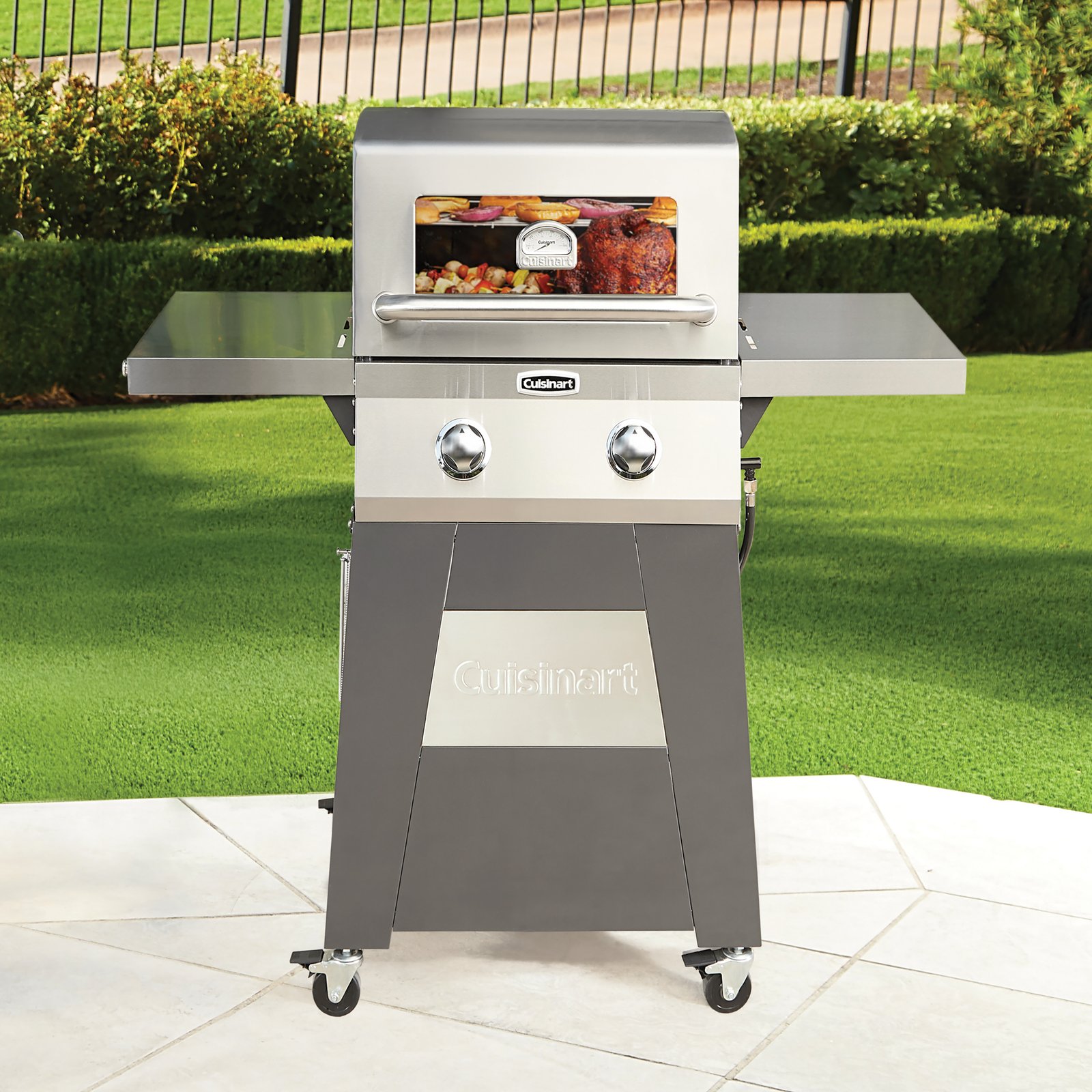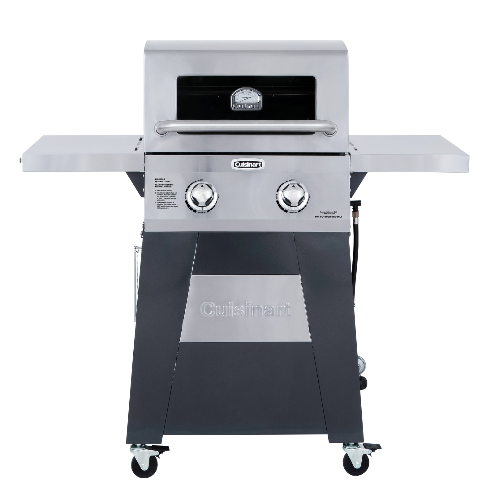 Set no limits to what your grill can handle with the Cuisinart Two Burner Gas Grill. Designed with form and function this grill is built to fit any space with foldable side tables. Experience exceptional cooking with durable cast iron cooking grates and a built-in appliance grade viewing window and temperature gauge that allows for easily monitoring without losing heat. This two burner gas grill offers ample cooking space with a boasting 503 square inches of cooking space on a grill designed to fit any space without limiting your outdoor living space. Whether it is hot dogs and hamburgers for the fourth of July or a turkey for Thanks giving, the Cuisinart Two Burner Gas Grill has you covered no matter what you are cooking.