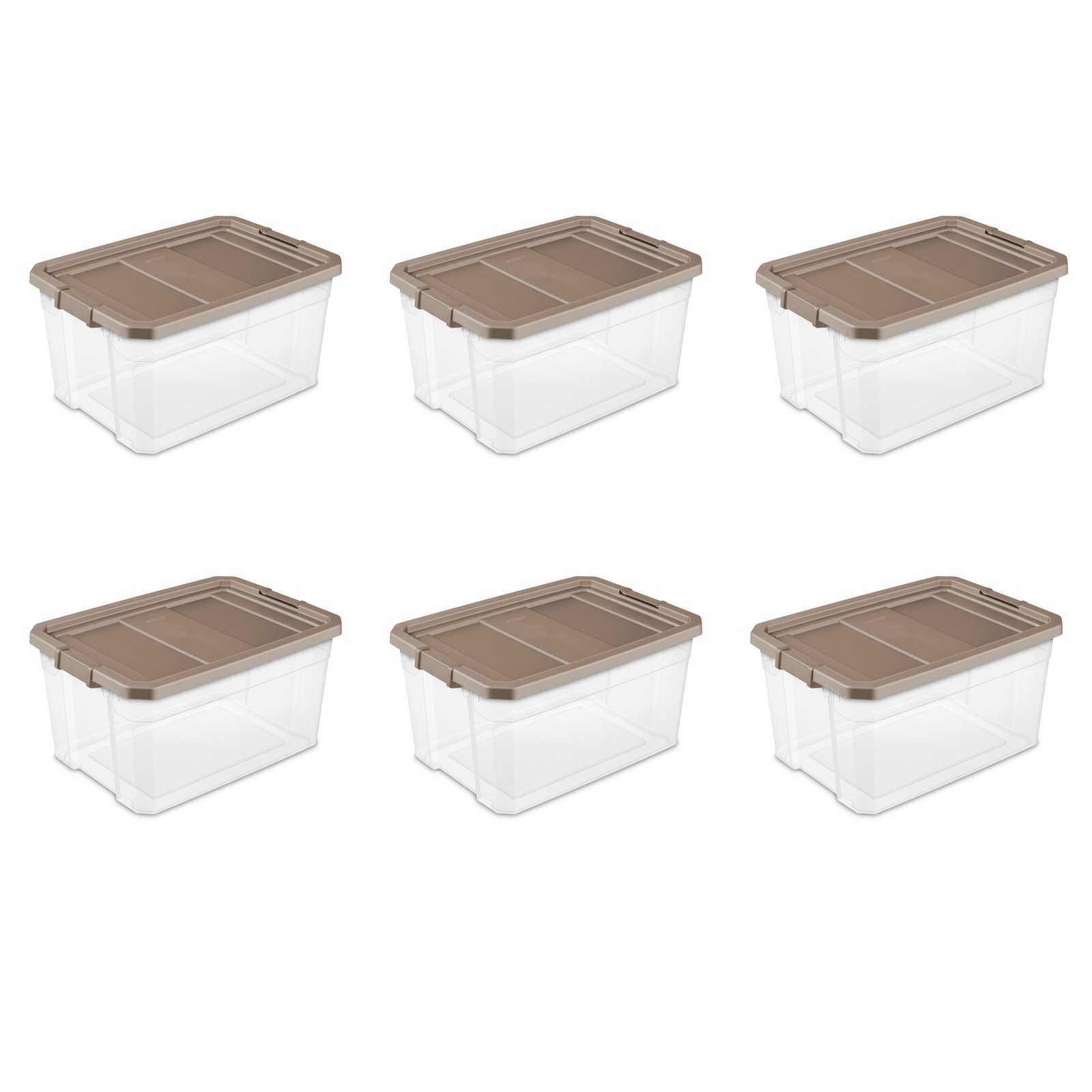In need of a durable storage system for closets, basements, garages, or attics? The Sterilite Modular Stacker line features rugged construction for added peace of mind that contents will stay safely stored inside. The 76 Quart Stacker Box is the perfect size for sports gear, out of season clothing, toys, and games, and the clear base allows quick viewing of contents. The robust latches offer extra security that the lid will stay attached to the base, and the textured surface makes for a sure grip when carrying. The deep recessed lids provide stability when stacking for efficient use of storage space. The 76 Quart Stacker Box shares the same lid as the 40 and 108 Quart Stacker Boxes allowing secure stacking of both the shallow and deep storage boxes in one footprint. The overall assembled dimensions of this item are 25 3/4″ L x 18 3/8″ W x 13 1/4″ H.Sterilite Adult Plastic 76 Qt. Stacker Box Taupe Splash Set of 6: