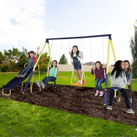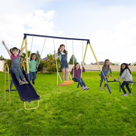 Spread the fun with the Palmview Metal Swing Set! With two blow-molded swings, a wavy slide, a standing swing, and teeter-totter, this swing set is sure to become an outdoor favorite with kids. Give your kids continuous active fun with the many activities this swing set has to offer! All Sportspower products meet or exceed all ASTM safety standards, so kids and parents can both enjoy the Palmview Metal Swing and Slide Set with a peace of mind. Product Features: