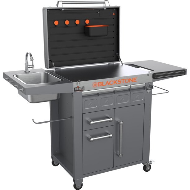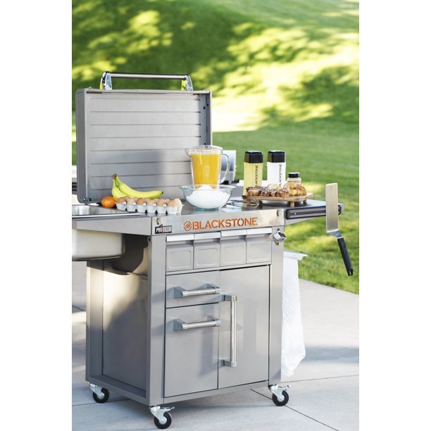 Blackstone’s Pro-Series Prep cart is a stainless steel prep surface and comes with a handy bottle opener and a large drainable ice drawer. Keep everything in reach with a magnetic tool strip, collapsible side shelves, and a removable sink, and do it all at night with a built-in light. Stash your spices and utensils for the next cookout in one of the four (4) small front drawers, a large cabinet, or two (2) large bottom drawers. Clean up is a breeze with the trash bag holder & pivoting paper towel holder. You’ve worked hard to master the griddle and this cart will help you to show your skills like a pro!