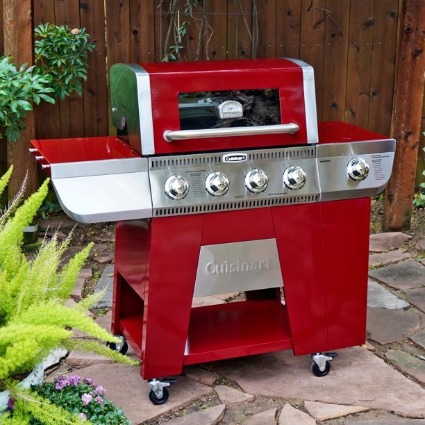 Bring a pop of color to your backyard and grill every meal with ease on the Cuisinart Four Burner Gas Grill with Dual Fuel Valves. Relax with effortless grilling; the appliance grade viewing window allows for you to monitor your food on cast iron cooking grates designed for an even cooking experience. Choose your grilling style with the option to convert this grill to natural gas. Expand your culinary skills and entertain the family from the comfort of your own home.