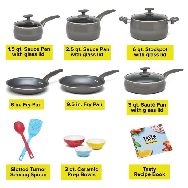 - Set Includes: 8 inch fry pan, 9.5 inch fry pan, 1.5 quart saucepan with glass lid, 2.5 quart saucepan with glass lid, 3 quart sauté pan with glass lid, 6 quart stockpot with glass lid, slotted turner, serving spoon with measuring marks, 3 ceramic bowls (2 ounce, 4 ounce and 6 ounce), recipe booklet