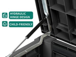 - PREMIUM MATERIAL- With two strong support hydraulic rods, this box delivers a comfortable angle for opening and closing; Upgraded smooth PP surface is durable, waterproof, and sunproof, the wood grain imitation can be easily maintained.