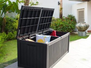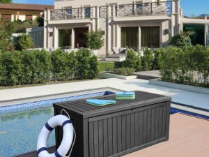This large, multi-functional outdoor storage box is ideal for your garden, courtyard, or pool area. Features a 150-gallon capacity that conveniently holds large items such as garden tools, large cushions, or pool equipment. In addition to a spacious outdoor storage solution, this deck box is also a practical patio bench that can optimize your outdoor living space and simplify your lifestyle.