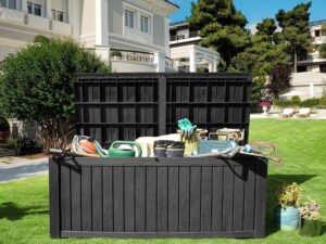 - IMMENSE STORAGE CAPACITY- This XL-sized outdoor storage box features a generous 150 gallon capacity; With dimensions of 61″L x 28.4″W x 25.4″H, the deck box offers ample space to accommodate both indoor and outdoor storage; Ideal for outdoor cushions, sports equipment, toys, tools, etc.
