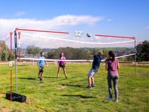 - Come with a set of quick setup regulation-size 180 ft. 1.25 inch thickness webbing boundary line with four pre-attached 6 inch steel ground stakes, one 8.5 inch synthetic leather volleyball with inflation pump and needle.